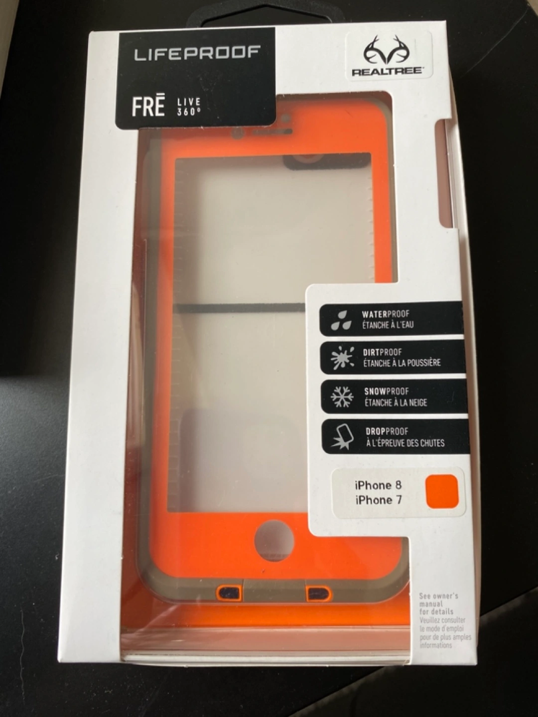 Porch pick up Leduc/Meet South Edmonton. Like New, in box. LifeProof FRE Live 360 protective case. Compatible with iPhone 7 and 8. Orange and Realtree camo. Waterproof, dirtproof, snowproof, and drop proof. $10 OBO Crossposted