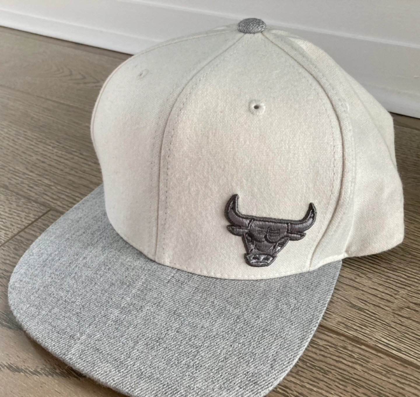 ThIs is a unique and rare CHICAGO BULLS NBA Snapback baseball cap by Mitchell & Ness from 2016. It is preowned but it looks brand new (I don’t think it was ever even worn once). It is cream coloured with gray accents. The Chicago Bulls icon is gray. It is 60% wool, 20% nylon, 20% acrylic. It would make a unique gift for any Chicago Bulls fan!