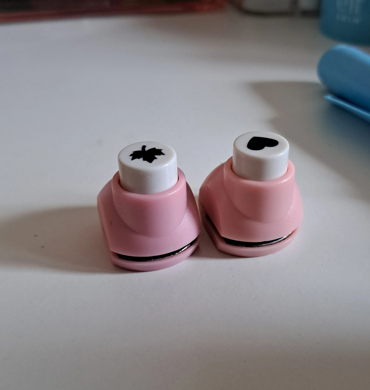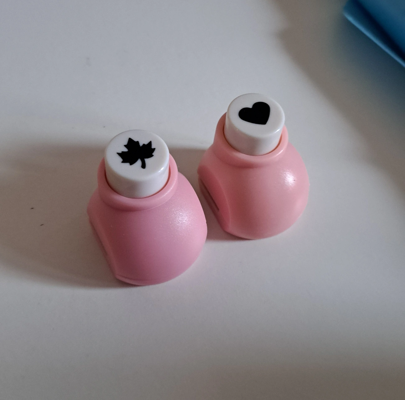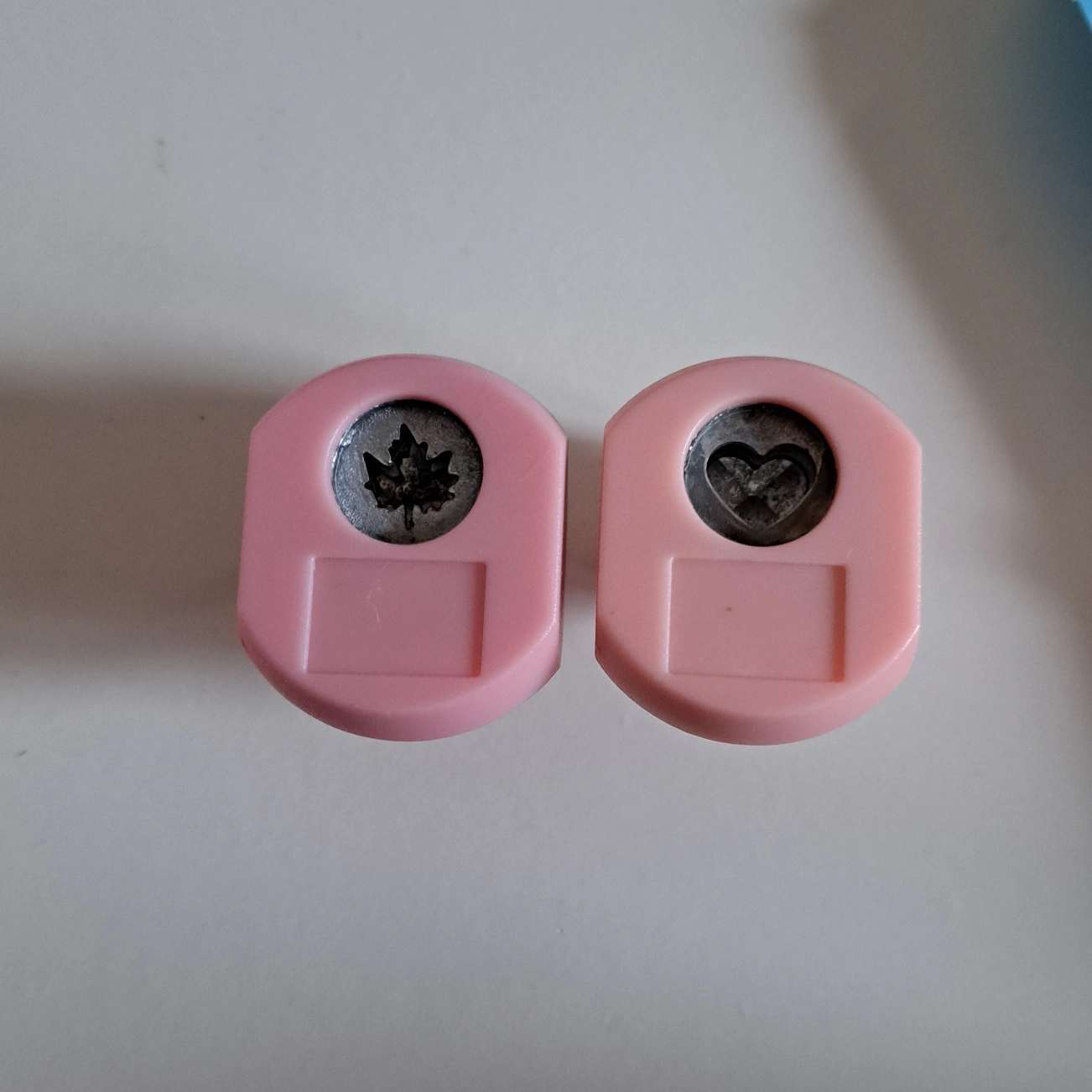 Set of two pink paper punches. One features a maple leaf design, the other a heart. Great for scrapbooking and card making. Compact and easy to use.