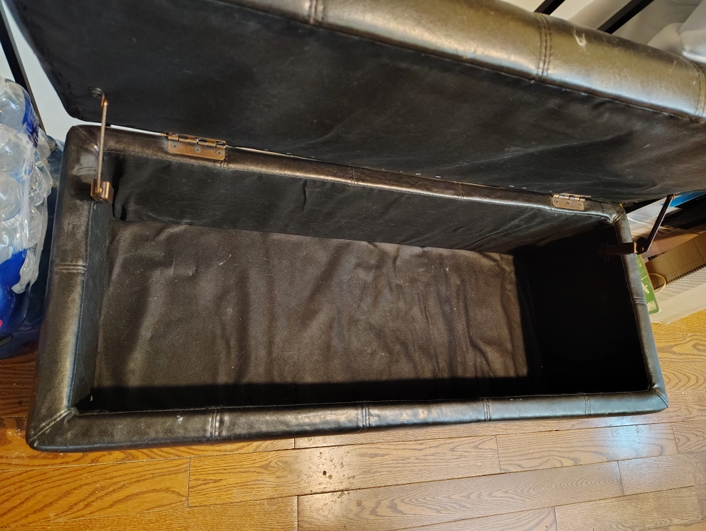 Espresso faux leather storage ottoman. Features a hinged lid and spacious interior. Good for extra seating or storage. A few scratches due to cat but in good shape. pick up Yonge and Finch area