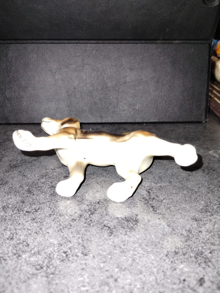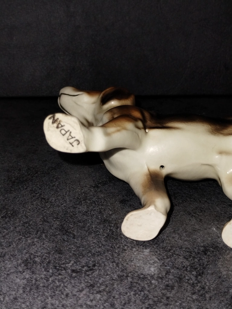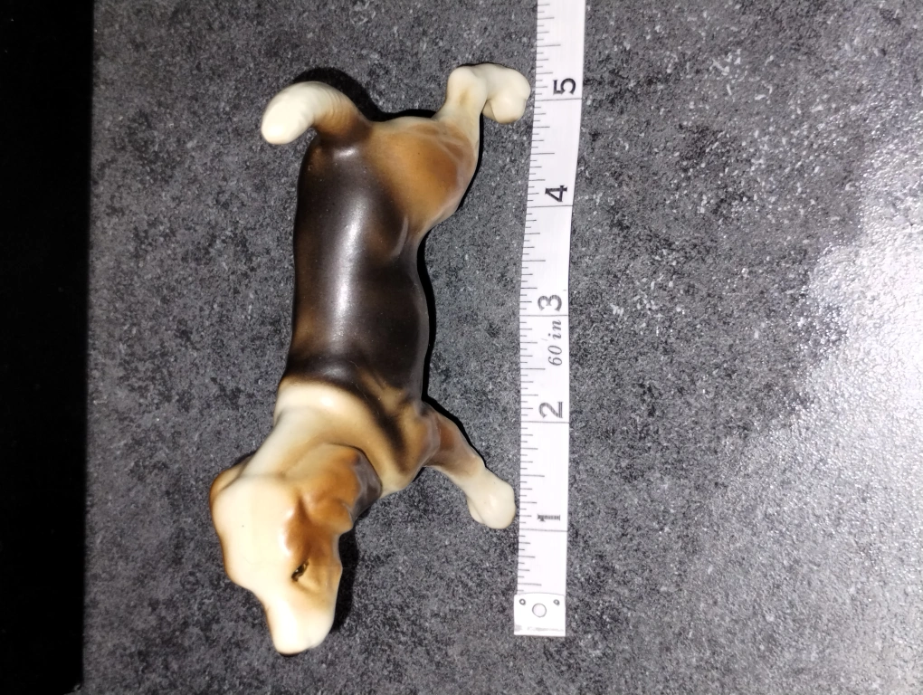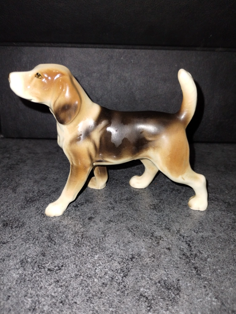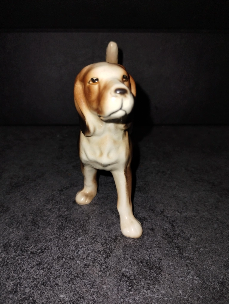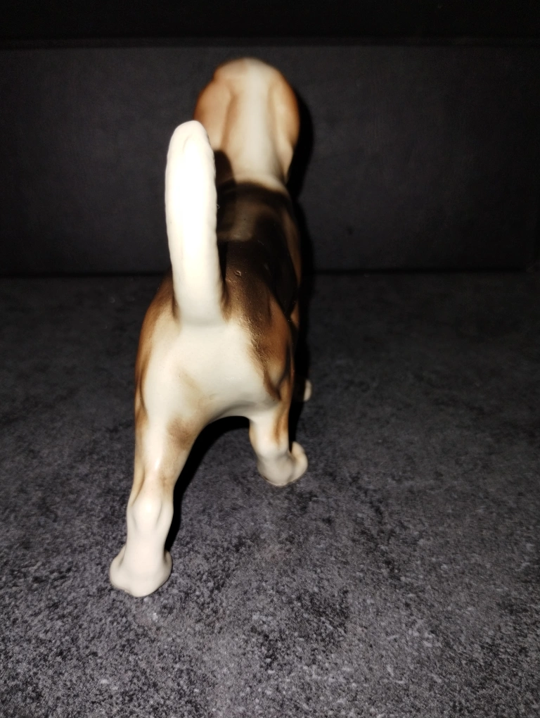 Adorable vintage porcelain beagle figurine. Brown and white colouring. Great addition to any dog lover's collection. Small size, perfect for a shelf or mantle.