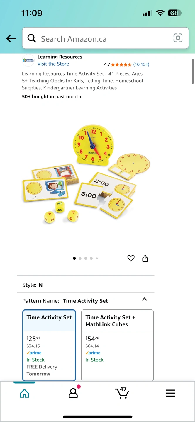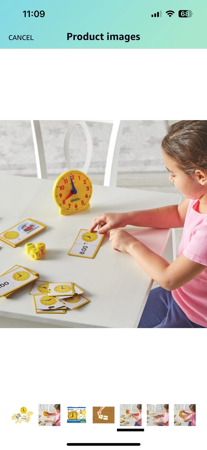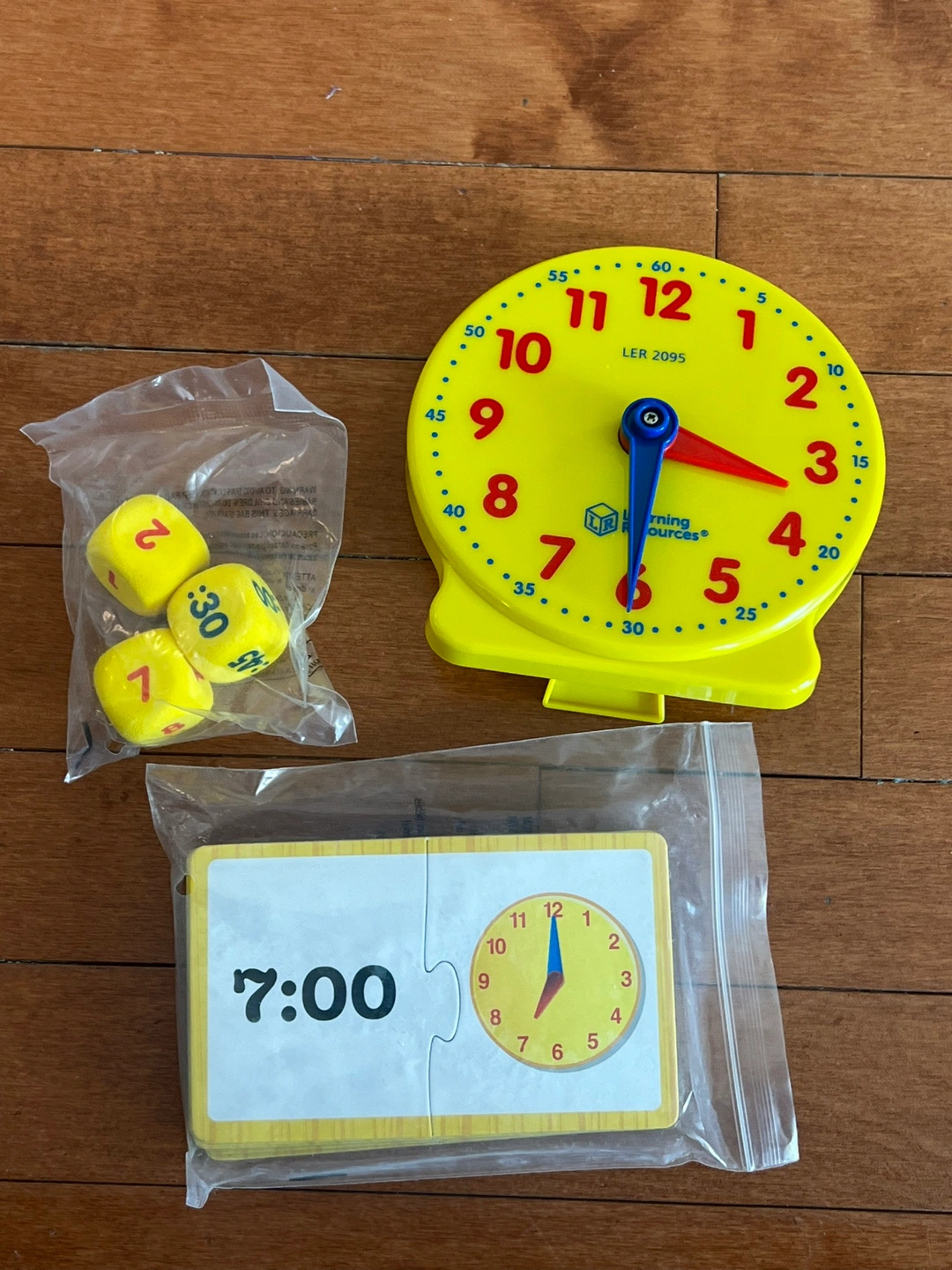 Learning Resources time activity set. Includes clock, number cubes (unopened in bag), and time puzzle cards. Great for teaching kids to tell time. Pick up only.