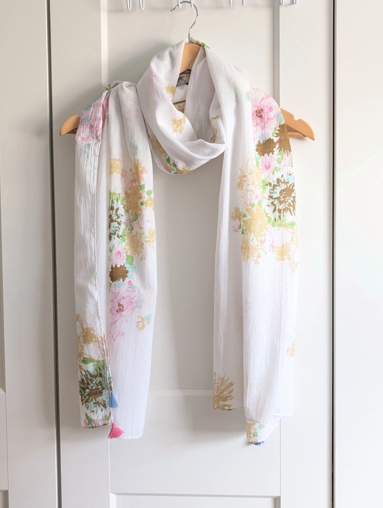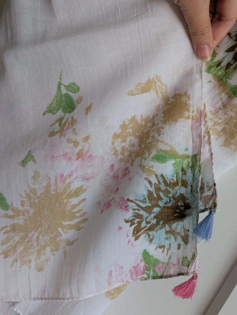 Brand new, never used 100% cotton Lightweight scarf. Floral pattern in pastel colours. Features small tassels at the ends.