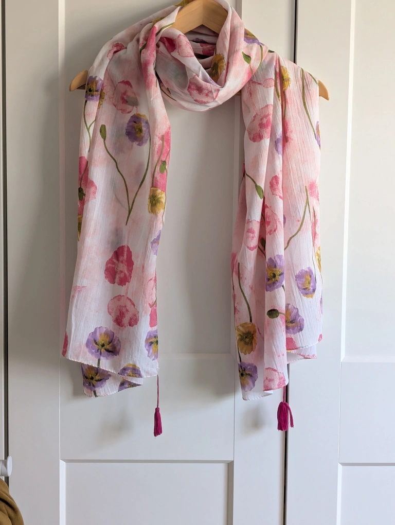 Brand new, never used 100% cotton Lightweight scarf with Pink, purple and ivory floral pattern. Features small tassels at each end. Perfect for spring and summer. πΊπ