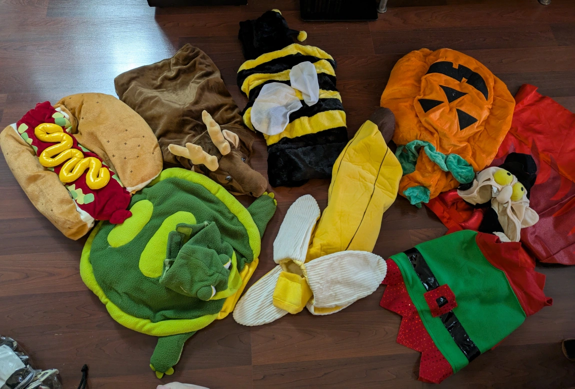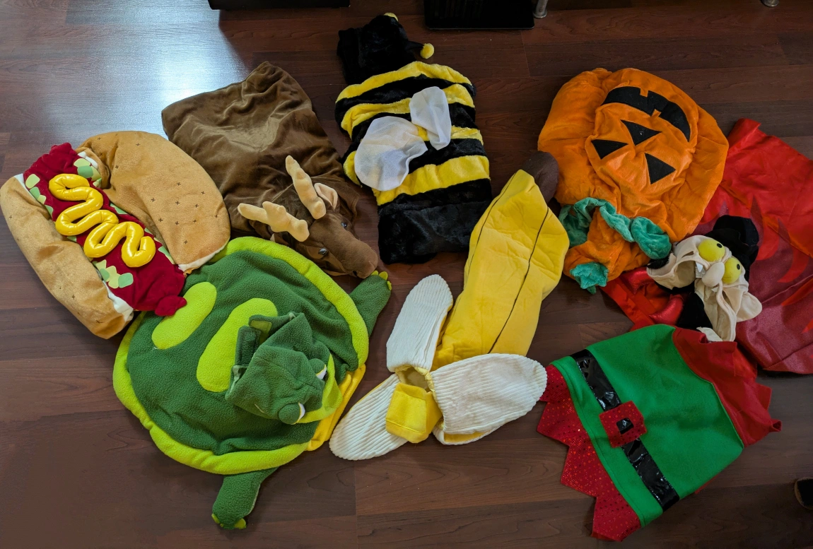 Includes hot dog, moose, bee, banana, pumpkin, turtle, elf, and vampire costumes.