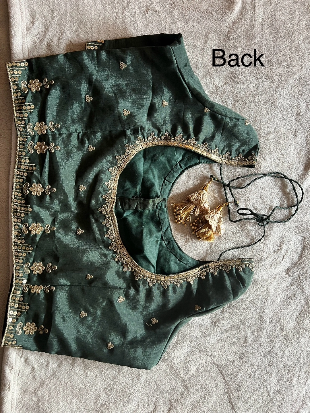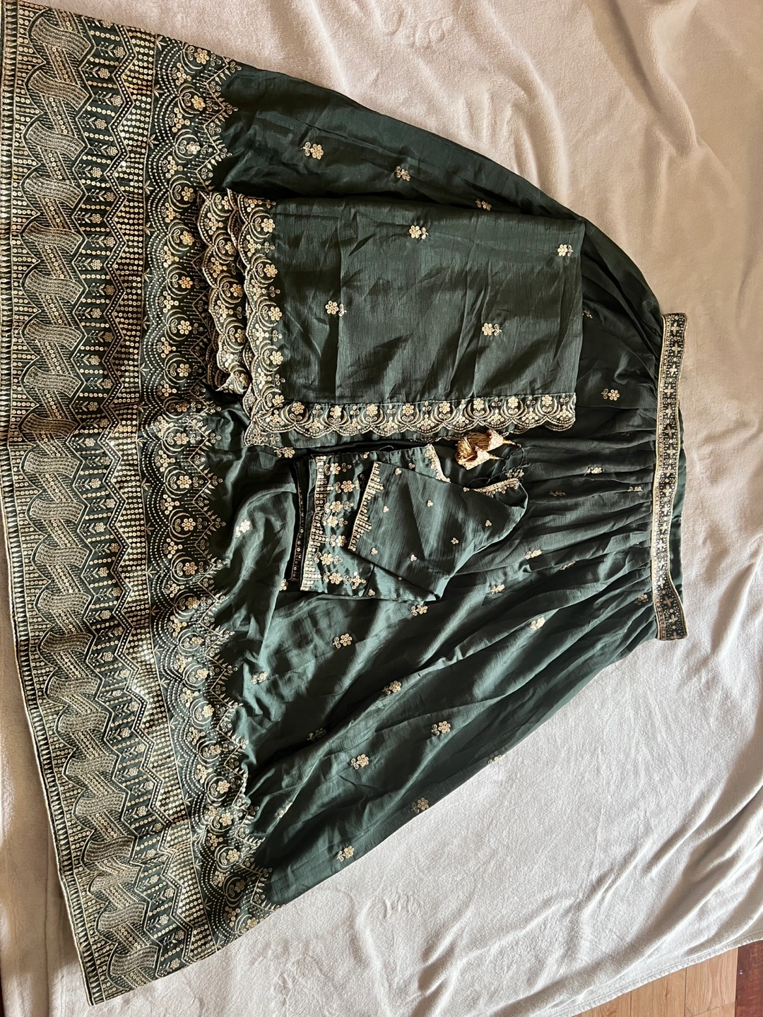 Beautiful dark green three-piece outfit..best for navratri or traditional wear…My parents just bought it from india in march and it’s blouse is too small for me as i have just delievered baby..