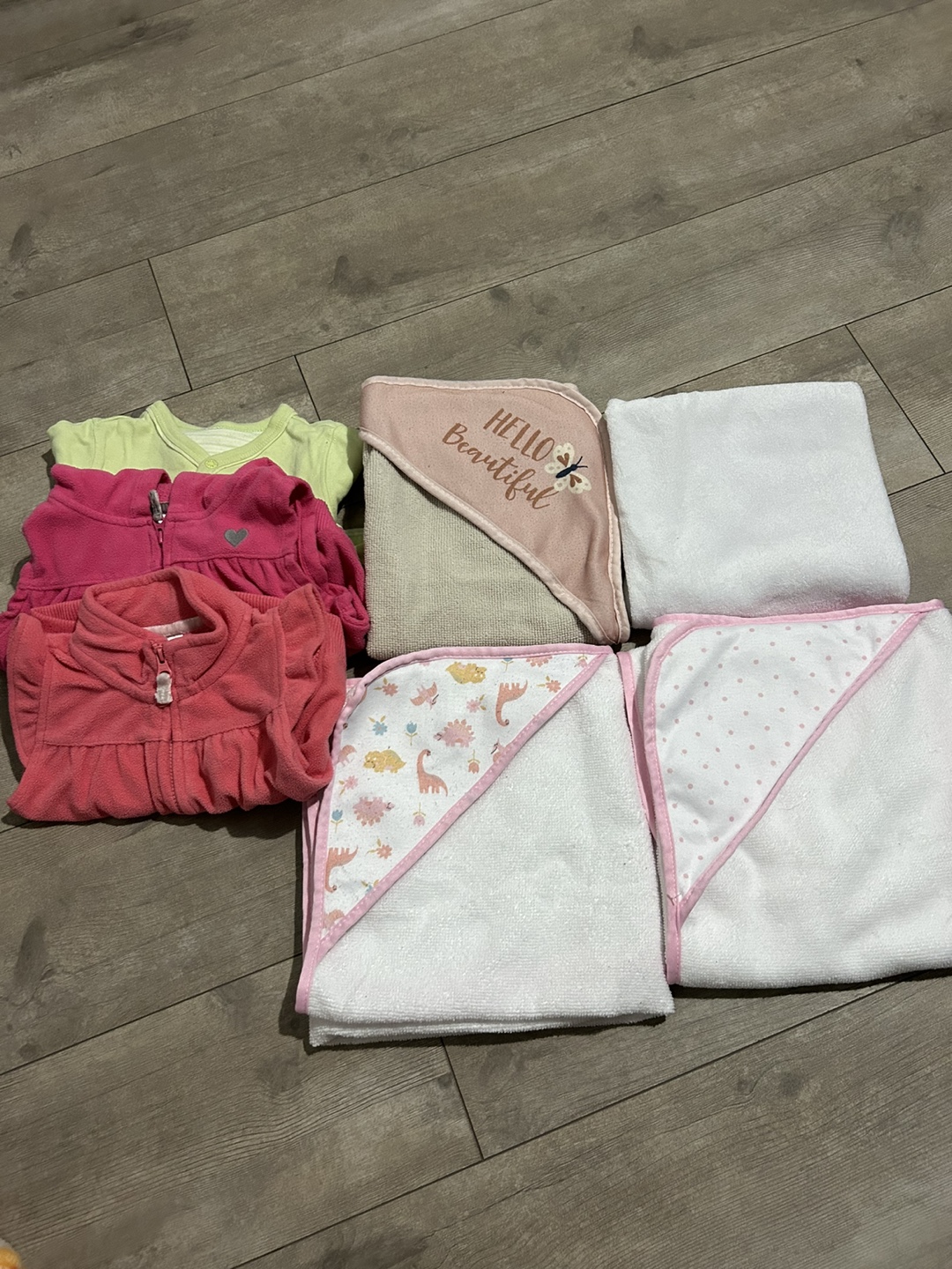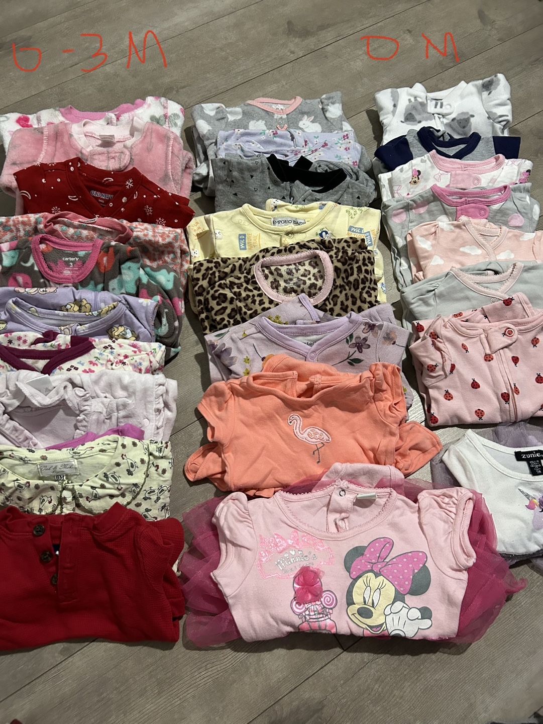 Large bundle of baby girl clothes. Includes sleepers, onesies, outfits, and outerwear. Various sizes from newborn to approximately 6 months. Some items are from Carter's.