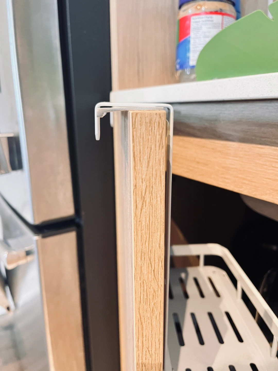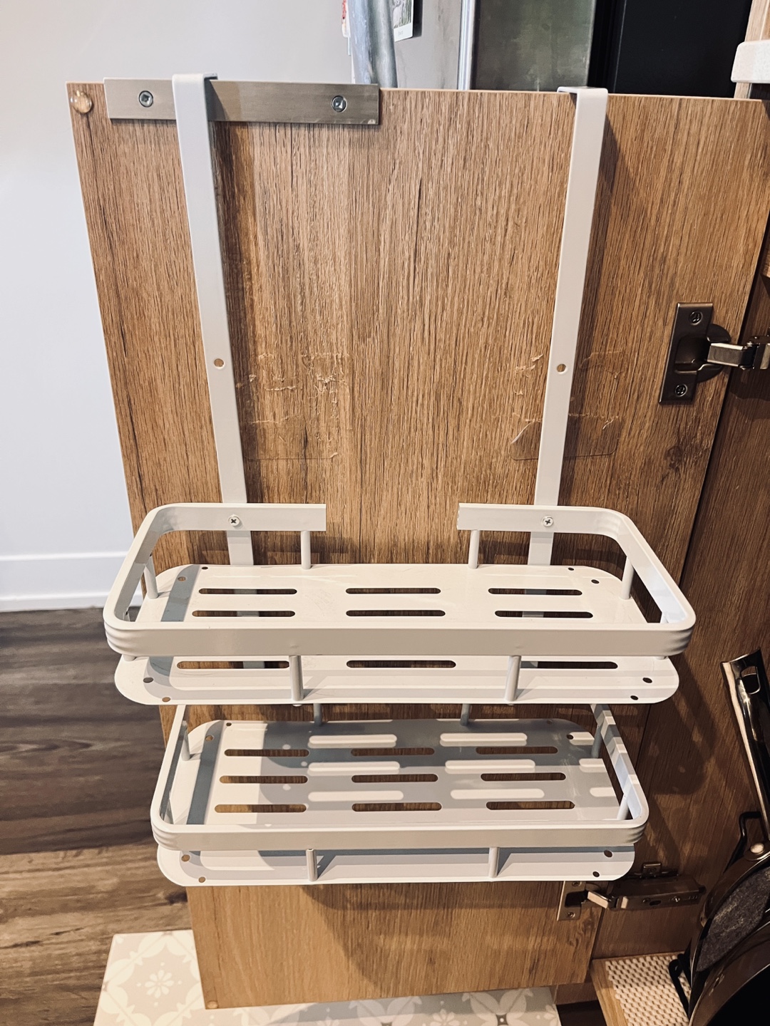 Space-saving, two-tiered storage rack. Attaches to cabinet doors. White metal construction. Easy installation. Perfect for maximizing kitchen or bathroom storage.