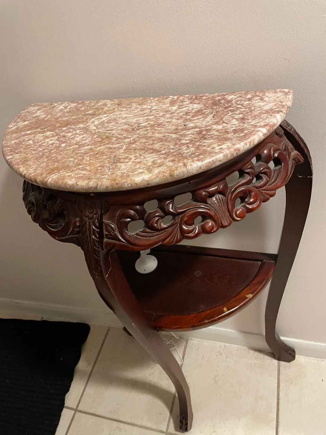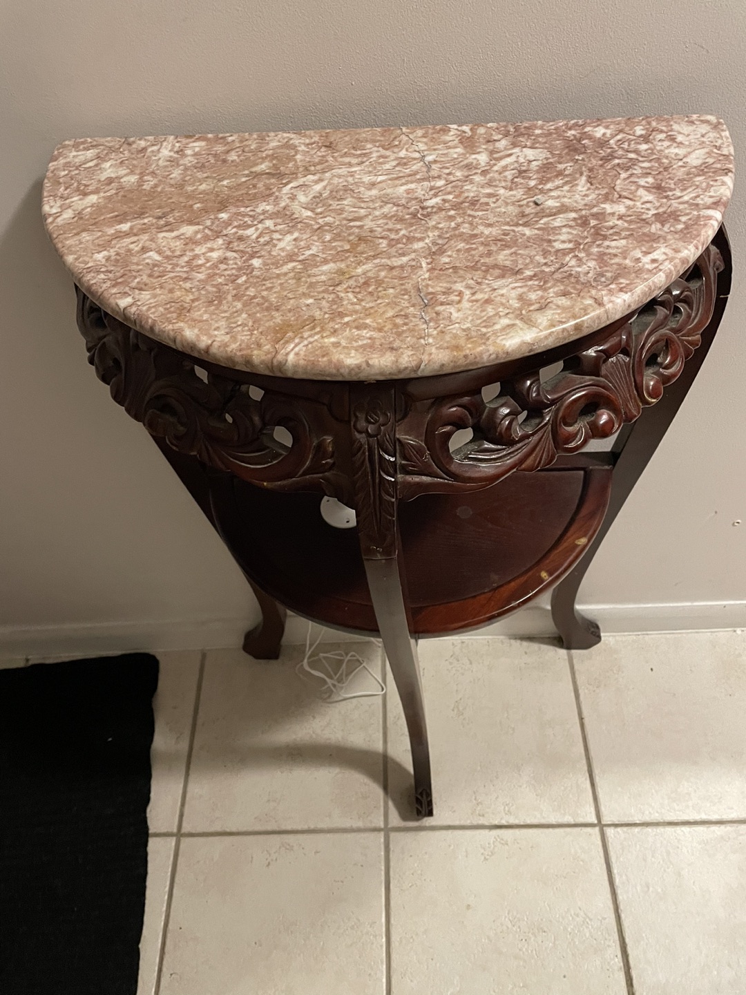 Got this at a novelty store they said it is maybe too and mahogany wood it seems to be either by composition or texture. Selling cuz moving. It’s a great decorative hallway or accent table or plant stand. Can send measurements. It’s 91cm tall by 55cm wide by 32cm deep