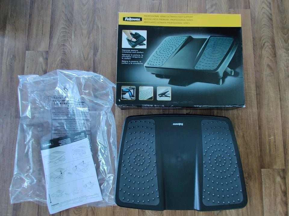 Adjustable footrest. Black plastic. Non-slip surface. Includes instructions. Excellent for improving posture and comfort.