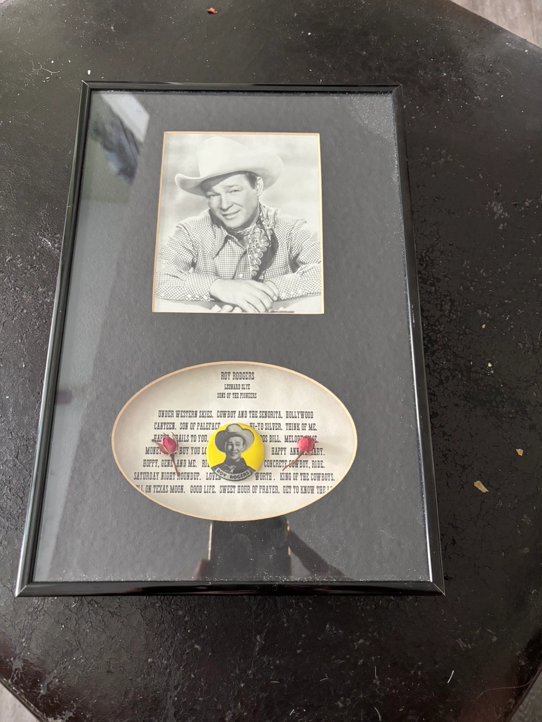 71Framed Roy Rogers memorabilia. Includes a photo and a pin Great for collectors.