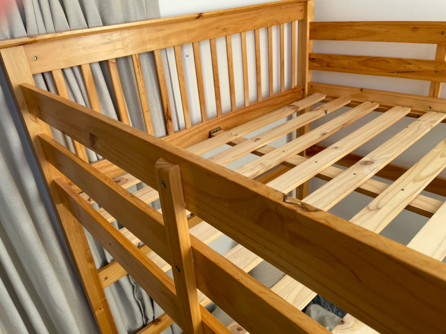 This loft bed requires a standard full mattress (54" x 75") with a recommended thickness of up to 7". It’s designed to offer 50 inches of under-bed clearance, perfect for a study area or extra storage space beneath.
