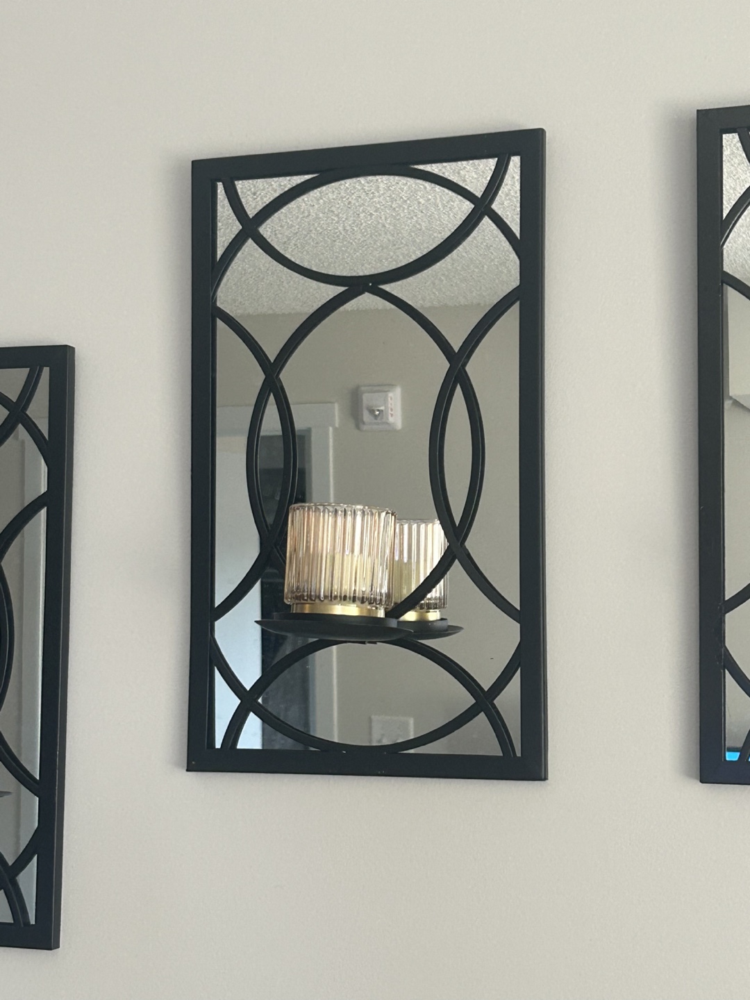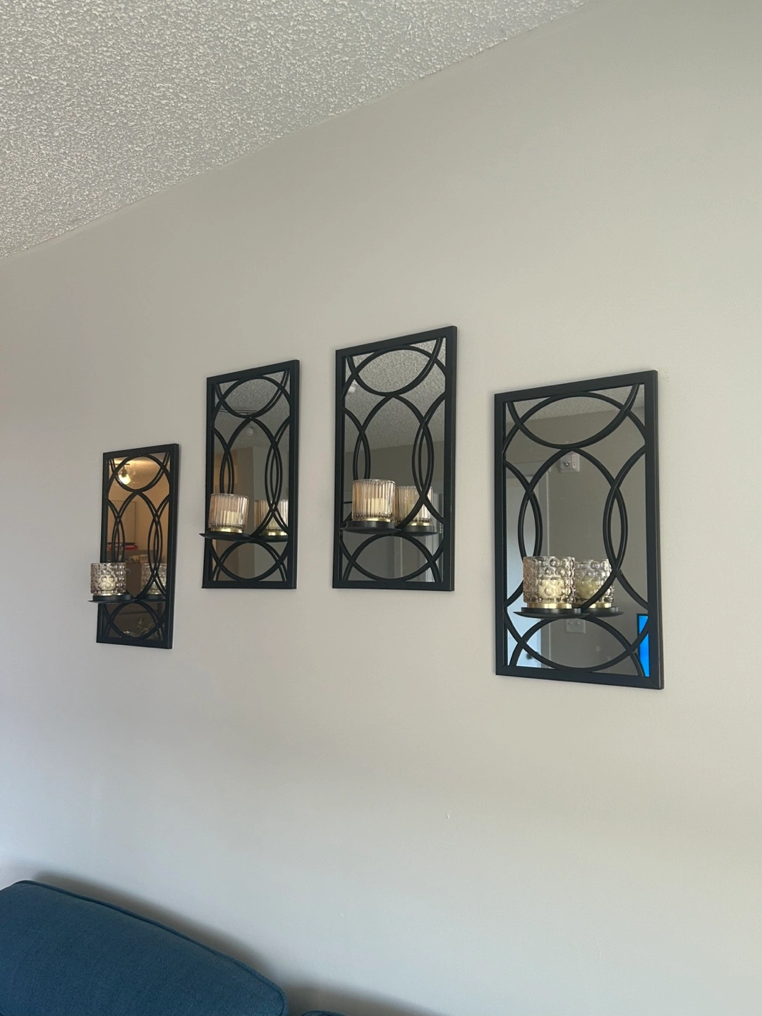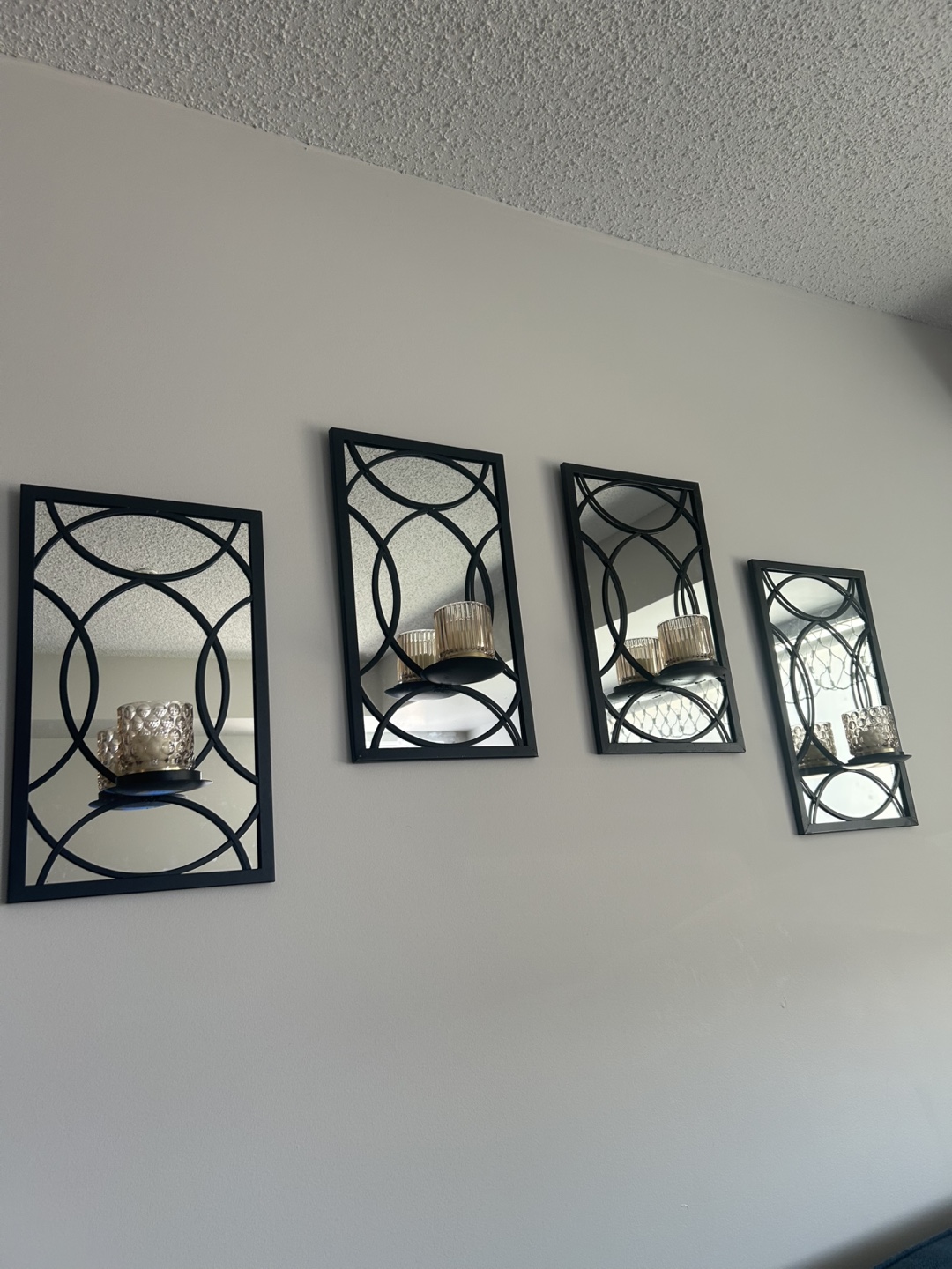 Four black framed mirrors. Each features a candle holder. Geometric design. Great for entryway or living room.