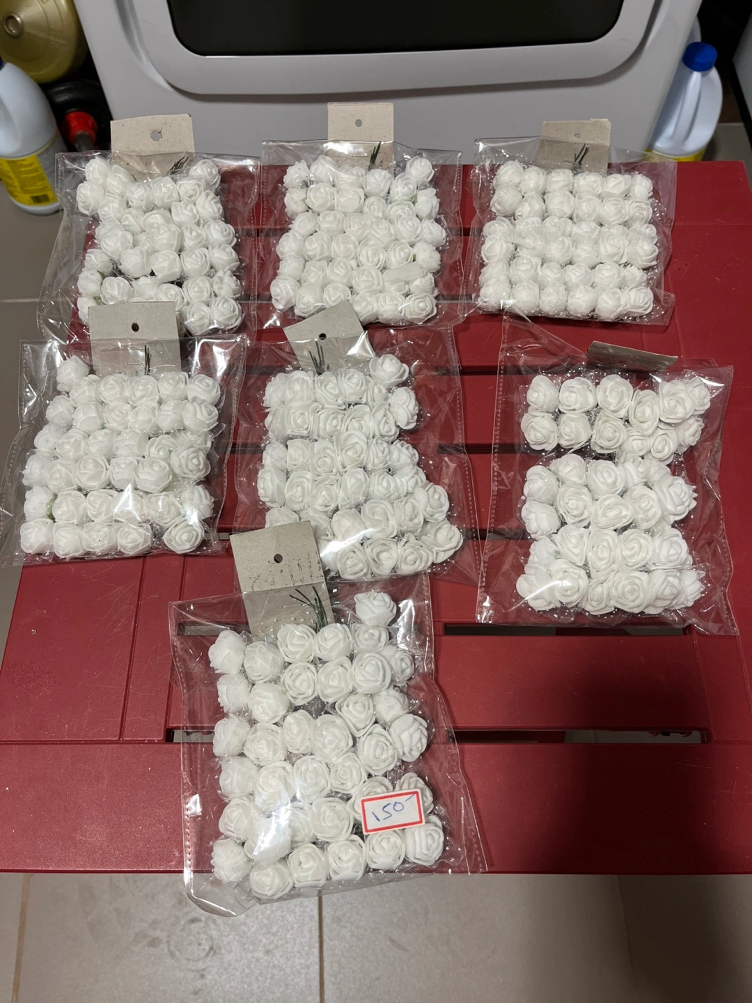 Assortment of artificial white roses. Multiple sizes and styles available. Perfect for crafting or home décor.
