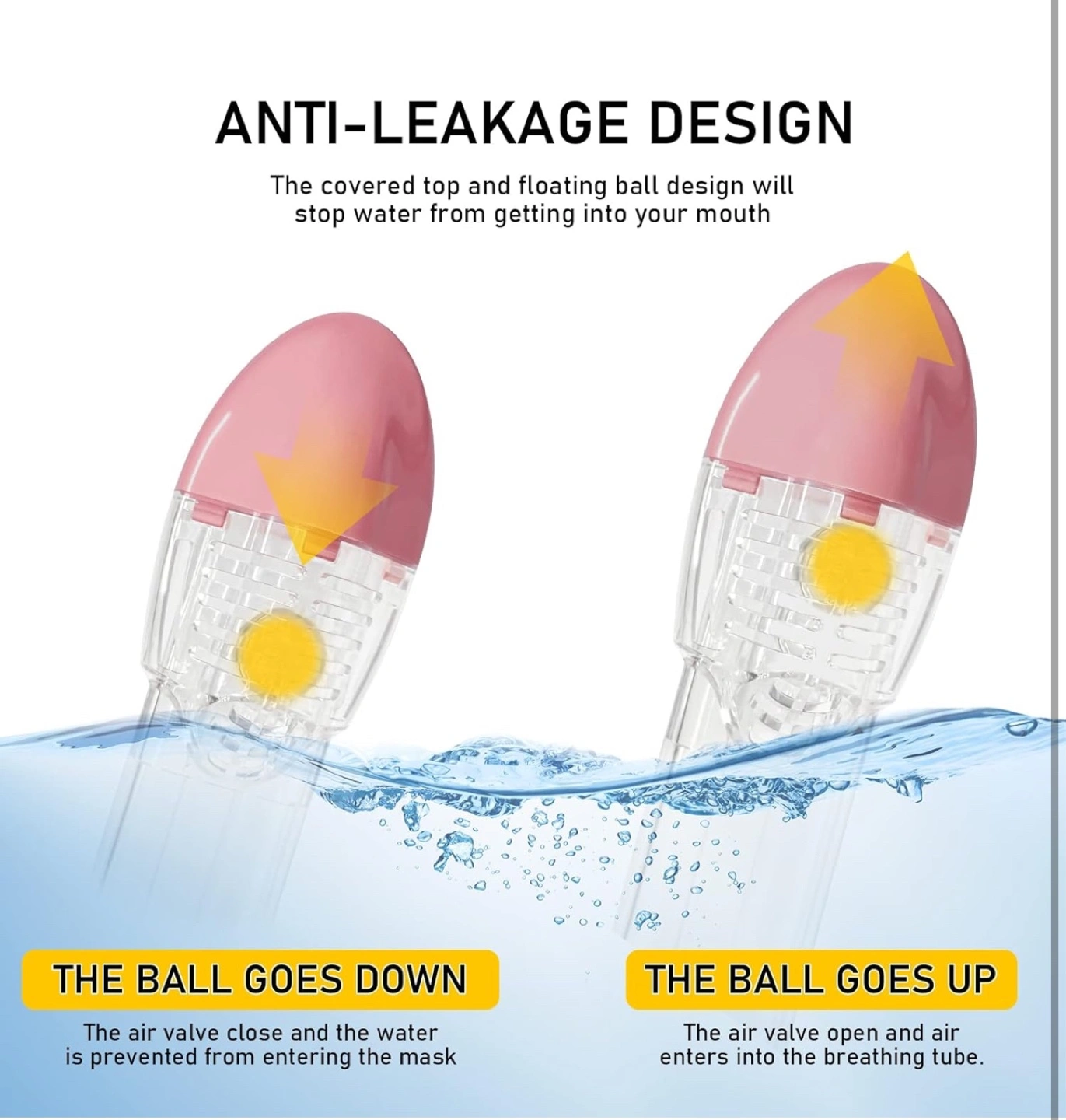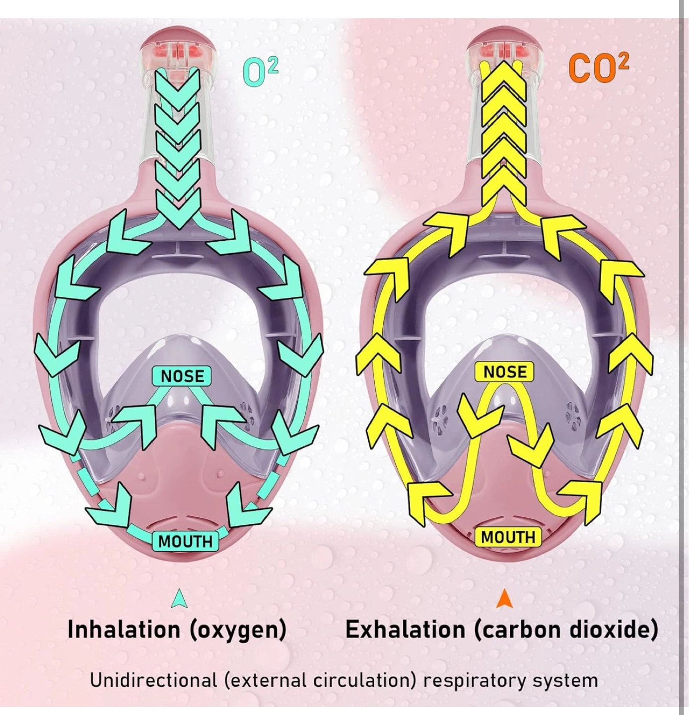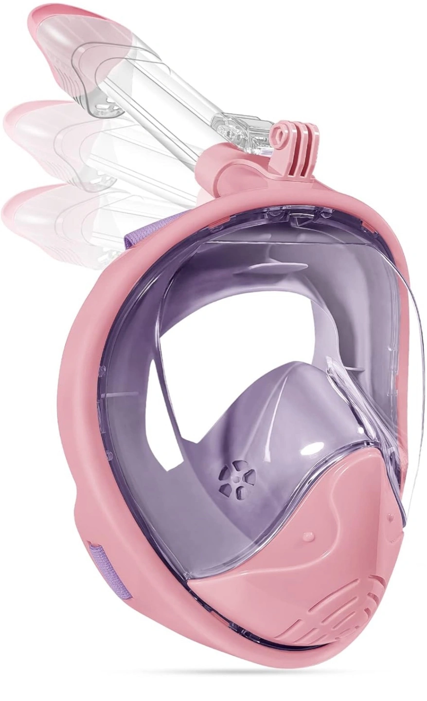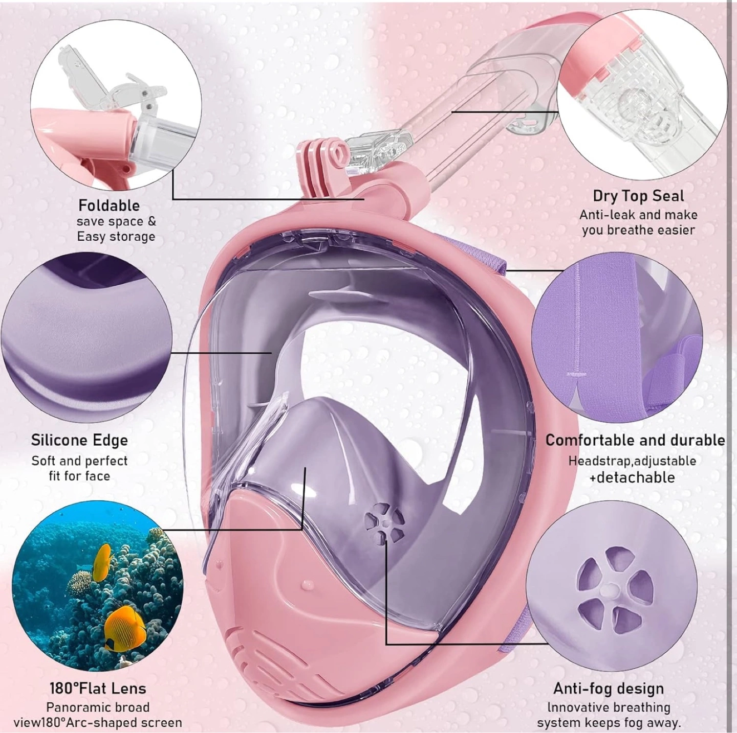 New Pink full face snorkel mask. 180° flat lens. Anti-fog and dry top seal. Comfortable and durable silicone edge. Foldable design for easy storage. Head strap adjustable and detachable. Small