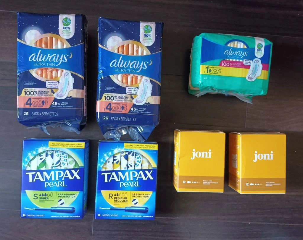 Variety pack of Always Ultra Thin pads, Always Ultra Thin pads, Tampax Pearl tampons (super and regular), and Joni pads. New and unopened.