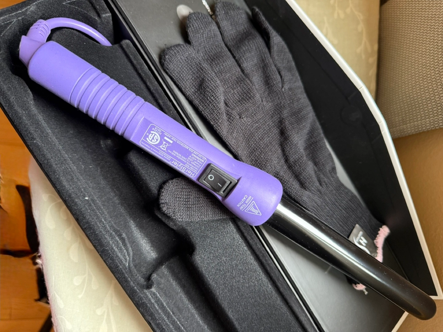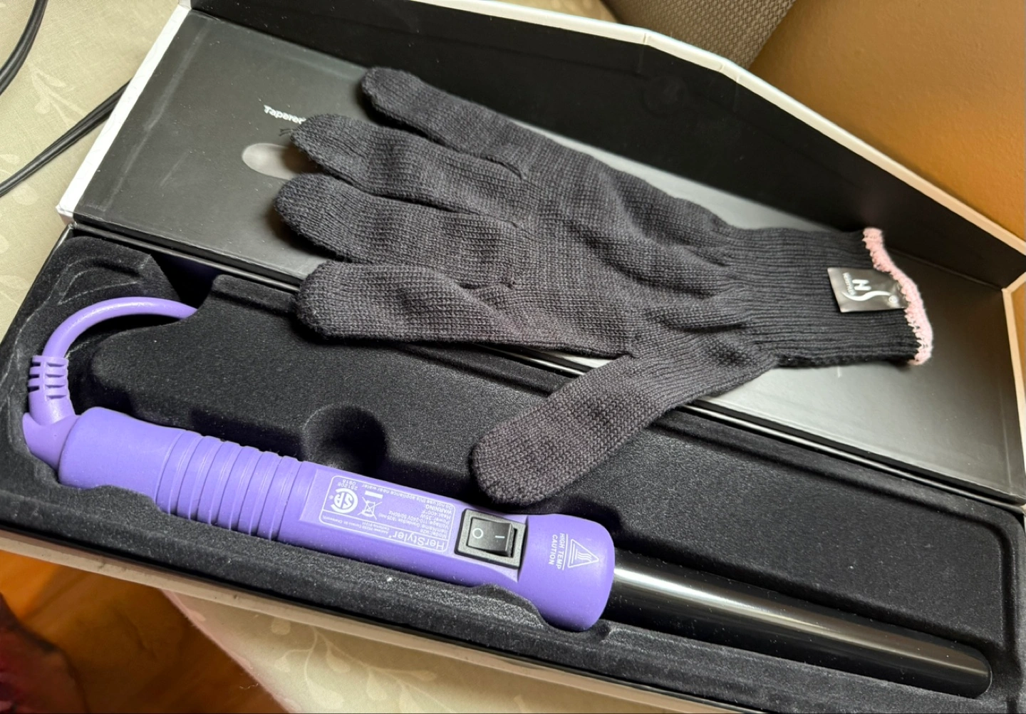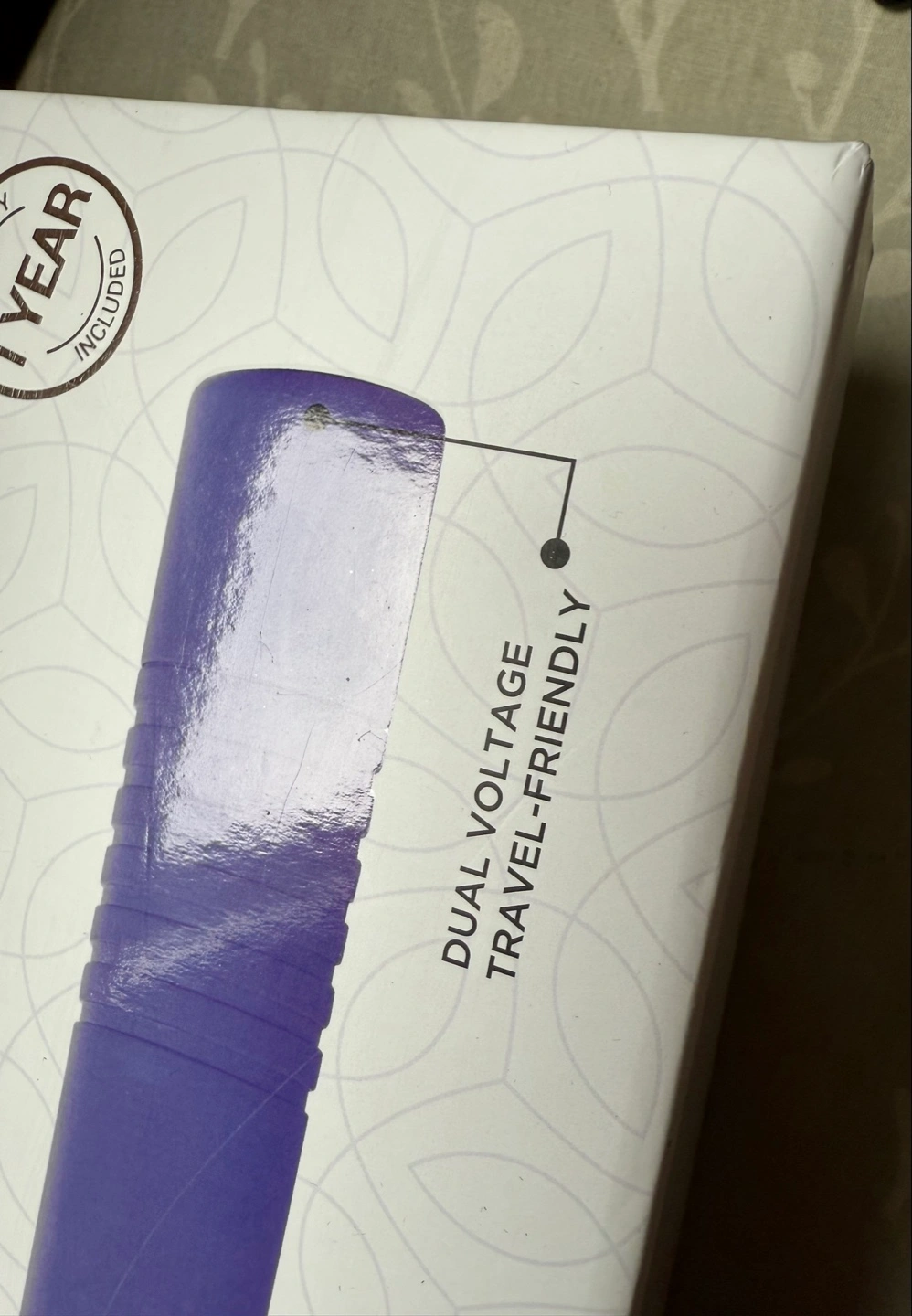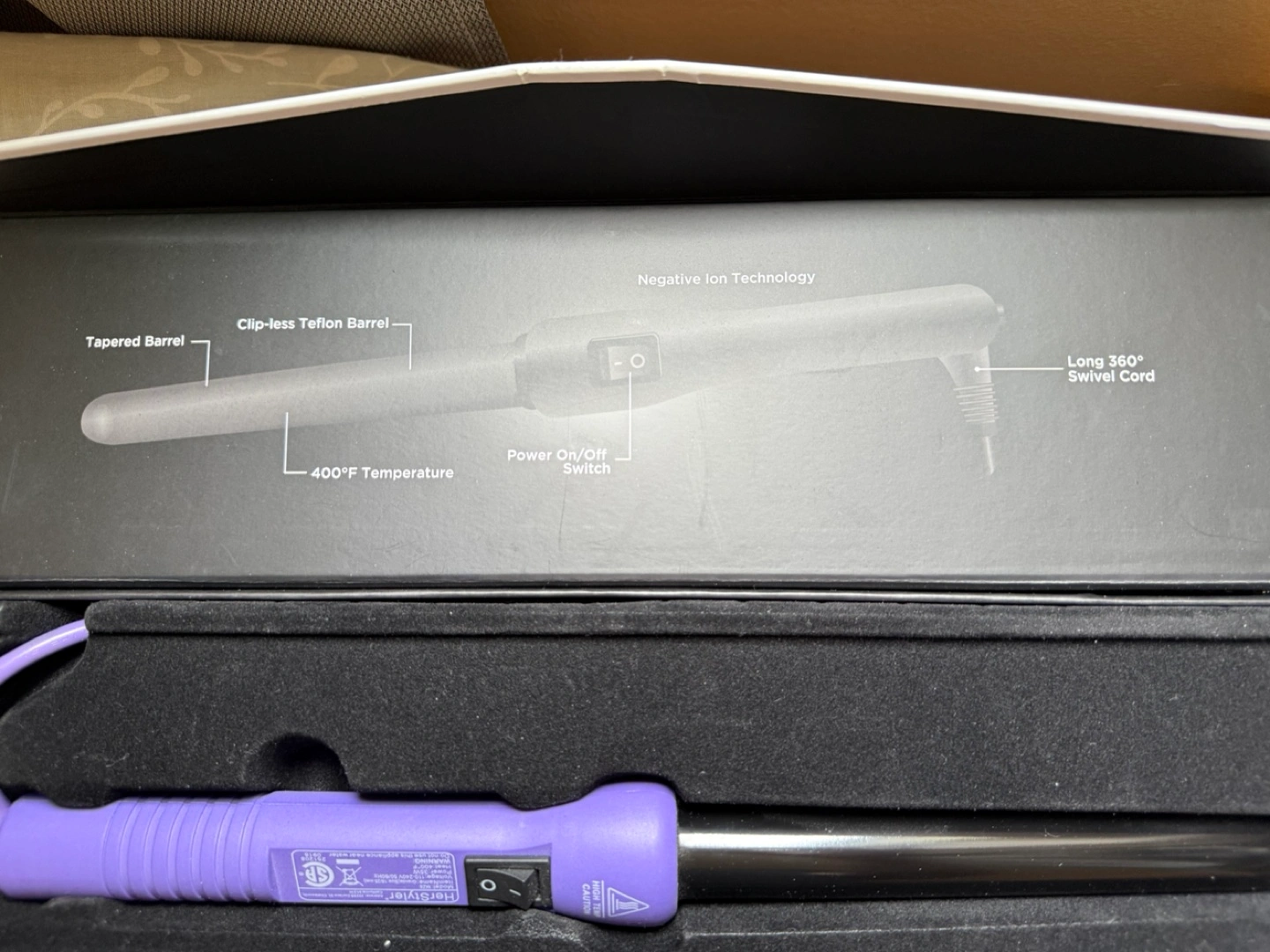 Purple curling wand. Includes heat resistant glove. Dual voltage, travel-friendly. Tapered barrel. Heats up to 400°F. Negative ion technology. Long 360° swivel cord. New never used only tried once. Bundle items from my other listings for a discounted price