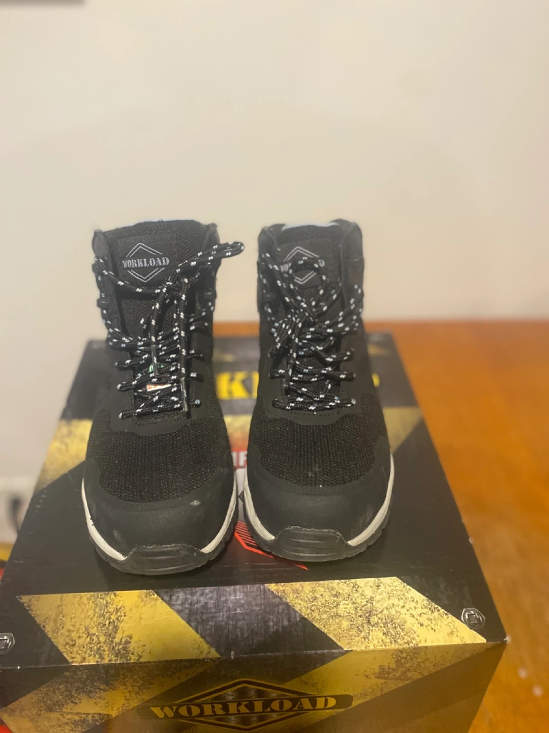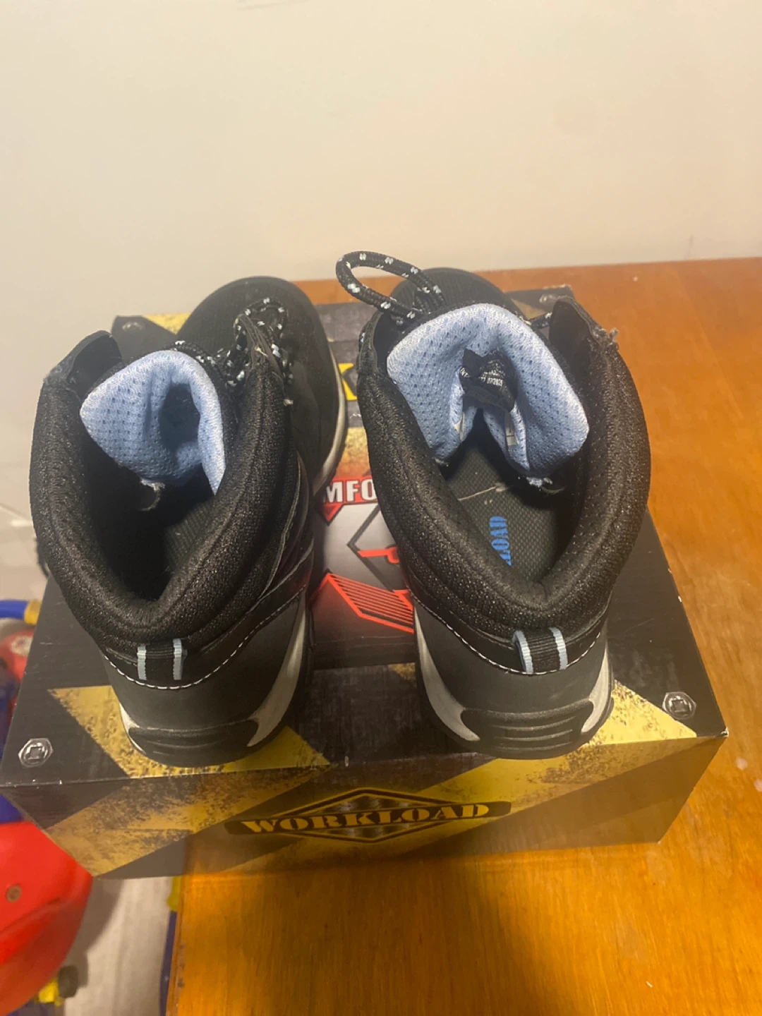 Workload composite toe work boots in black. These boots feature a durable construction with a composite toe for protection. They come with the original box. Used for 1 day.
