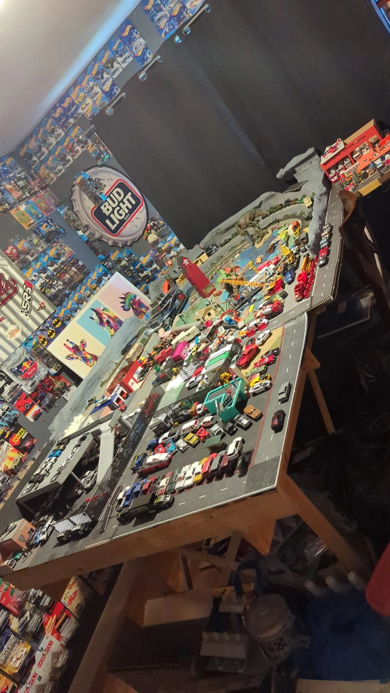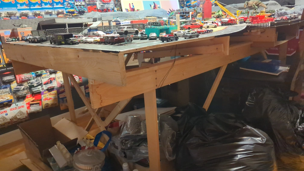 Wooden display table, custom built. A great spot to organize a model car collection. The surface has a variety of scenery. It appears to be an immersive display, with multiple roads, buildings, and various elements. comes apart in 2 half's. downsizing and need to space cars and houses not included. pickup only