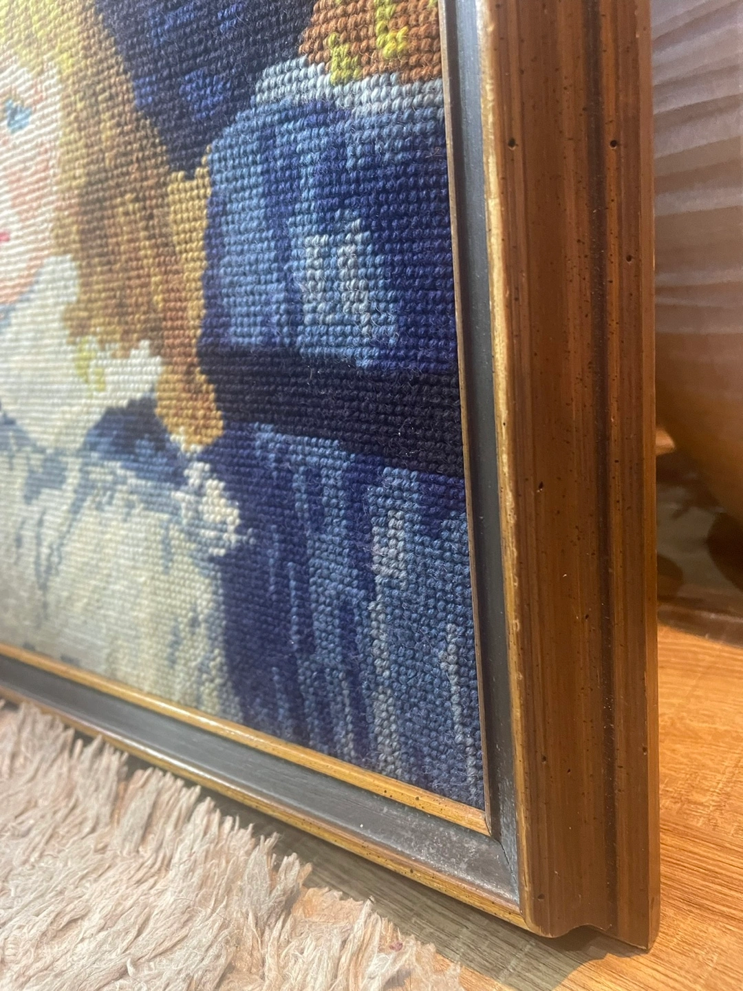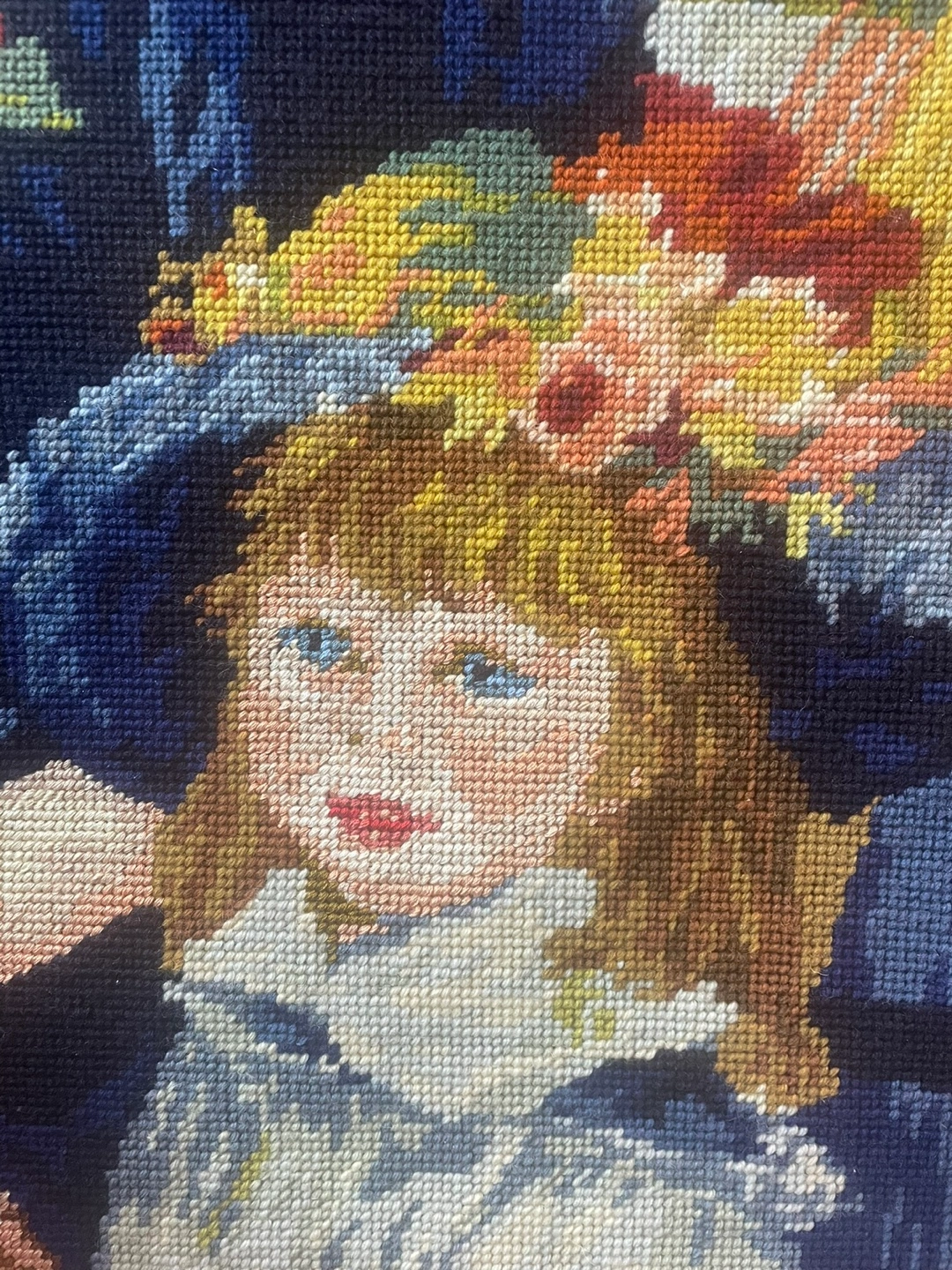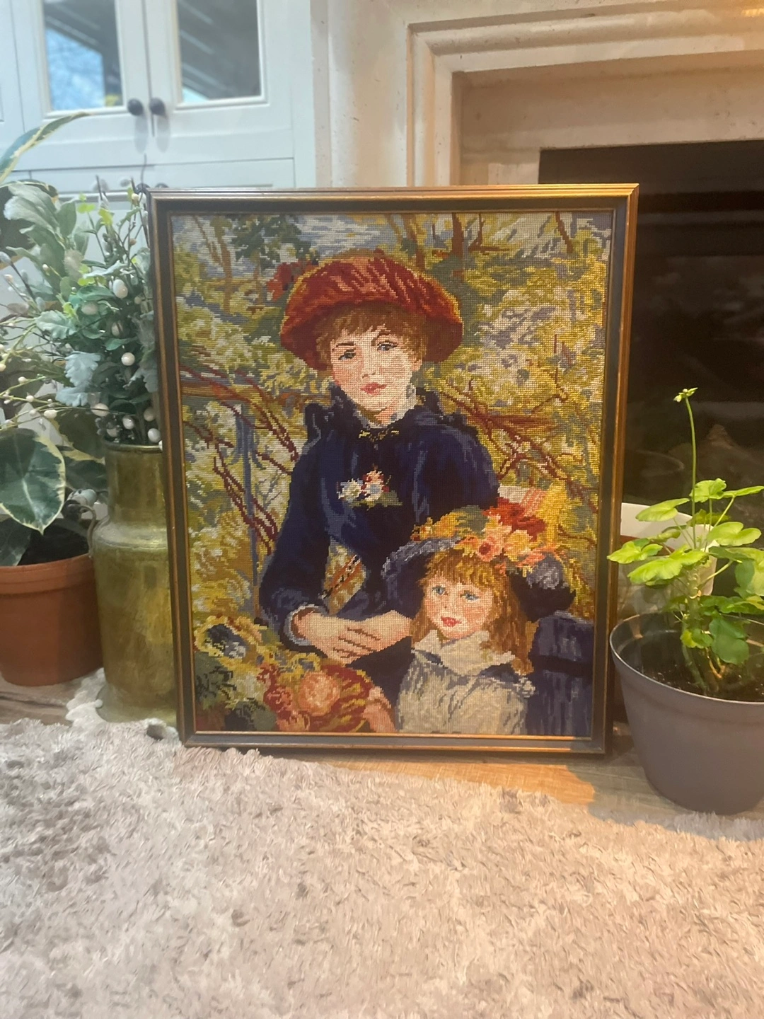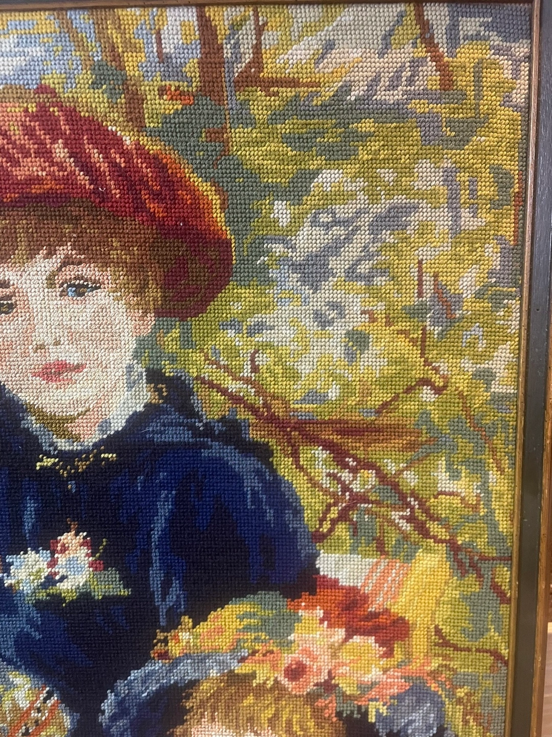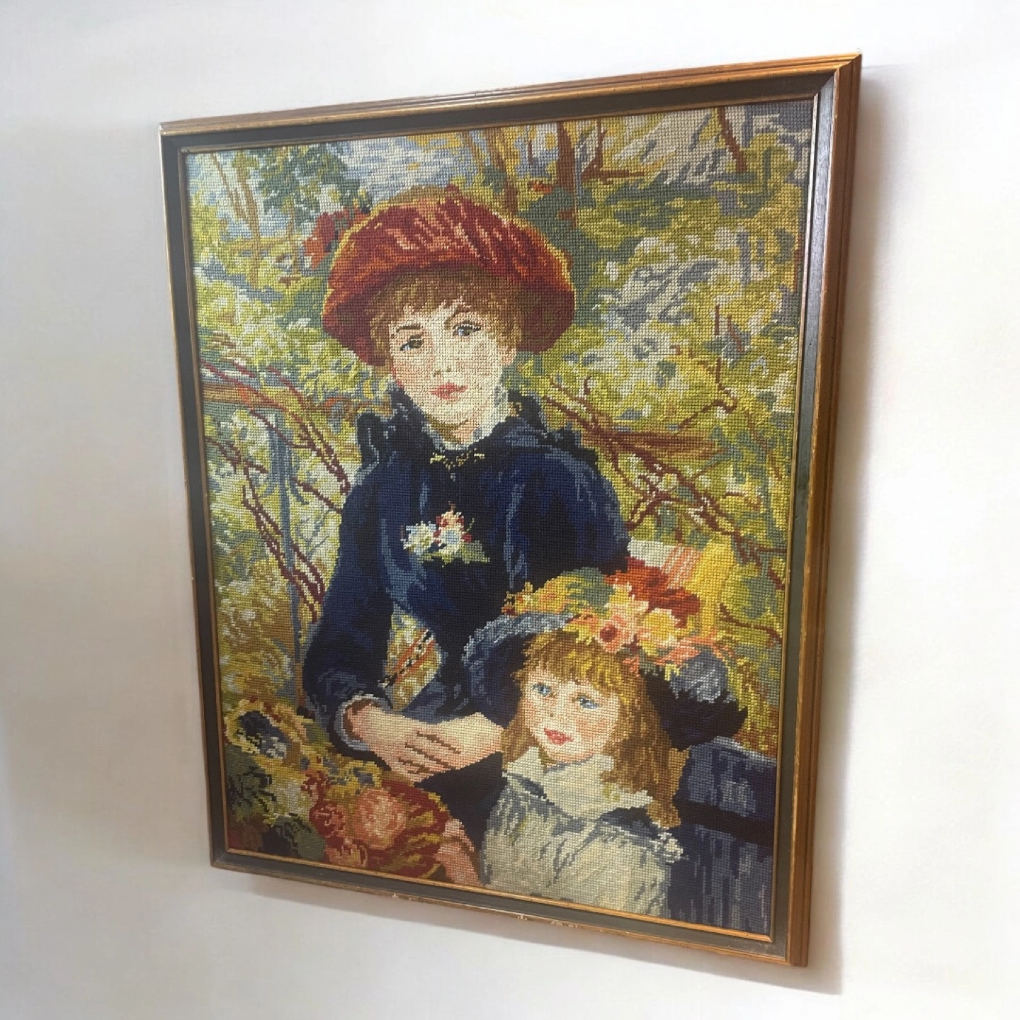 Stunning hand-stitched vintage needlepoint of Pierre-Auguste Renoir’s masterpiece “Two Sisters (On the Terrace).”