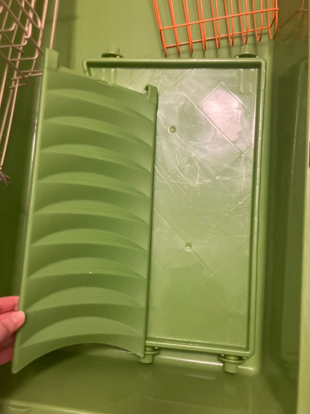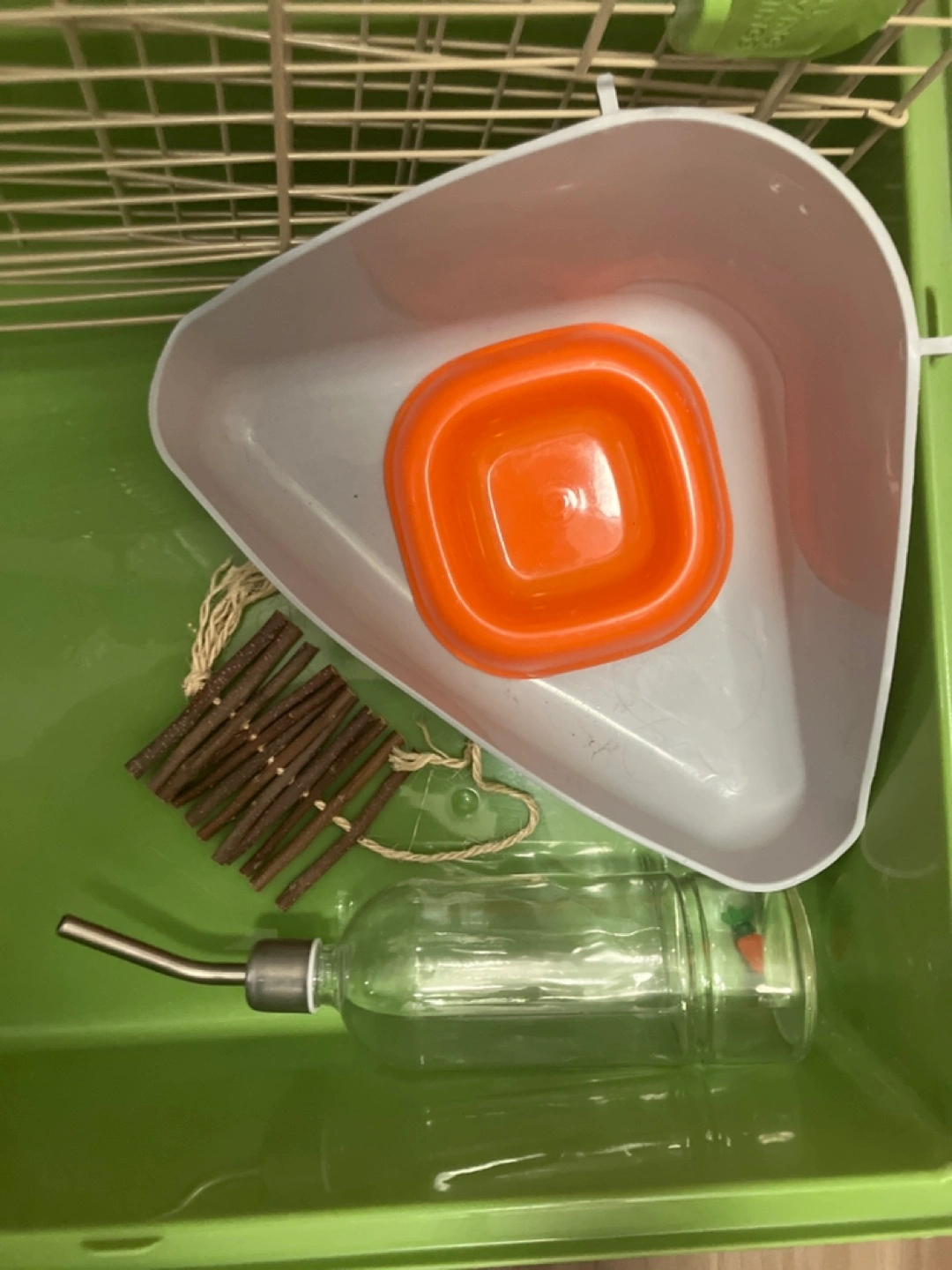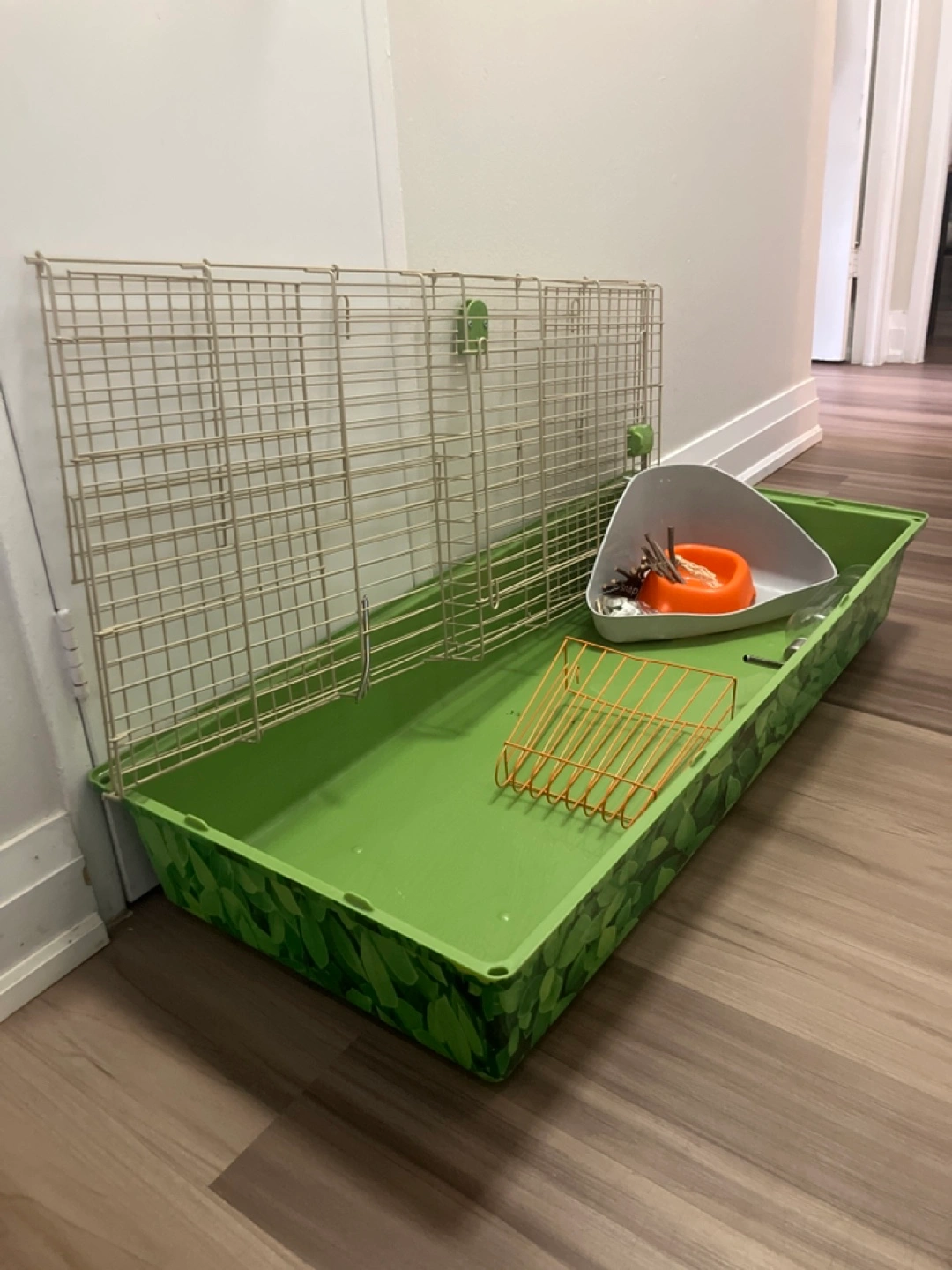 Green Critter Nation small animal cage. Includes food bowl, water bottle, hay rack, and corner litter pan. Measures approximately 17” x 40”