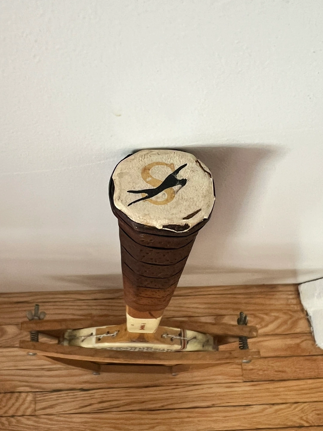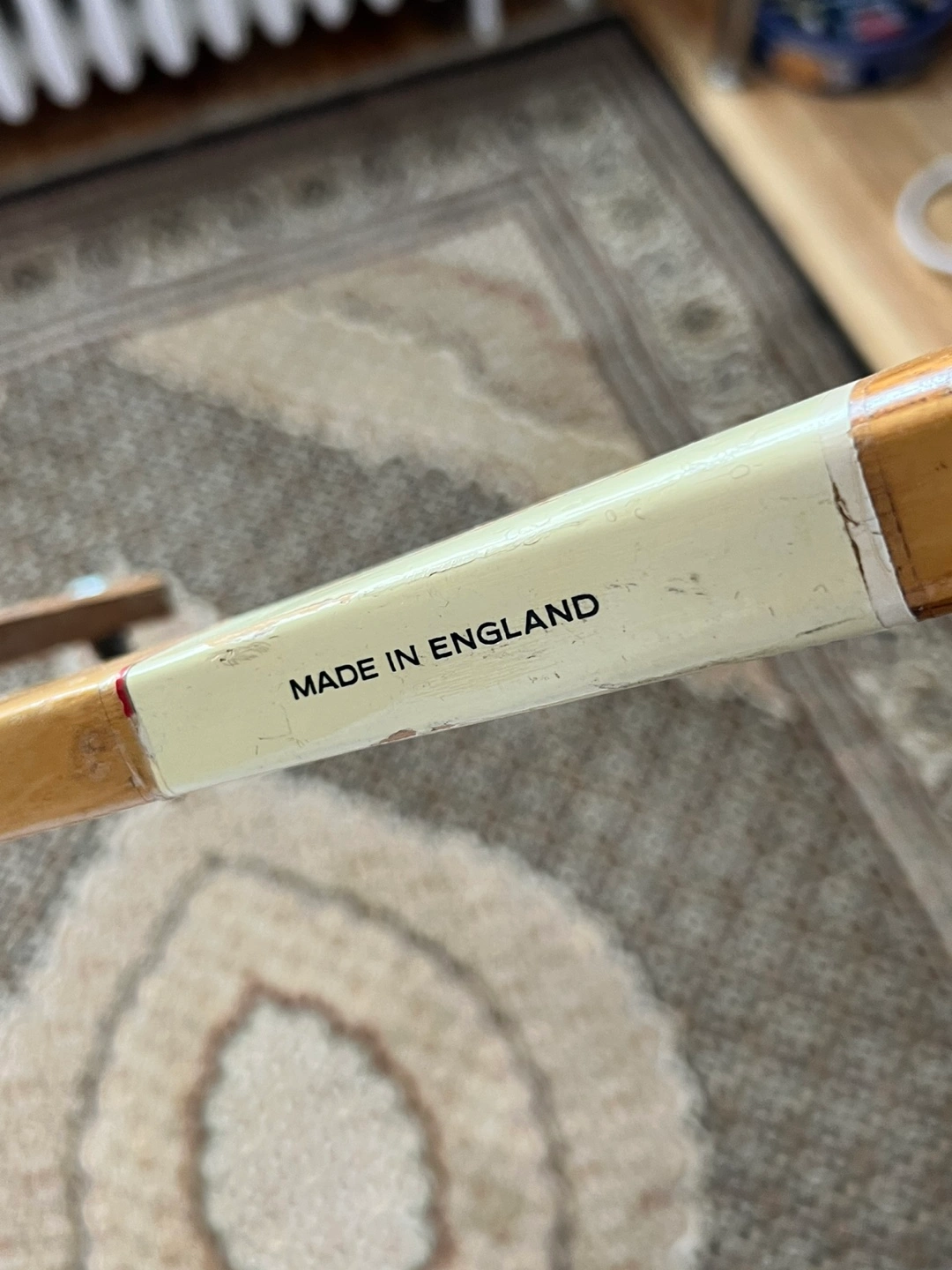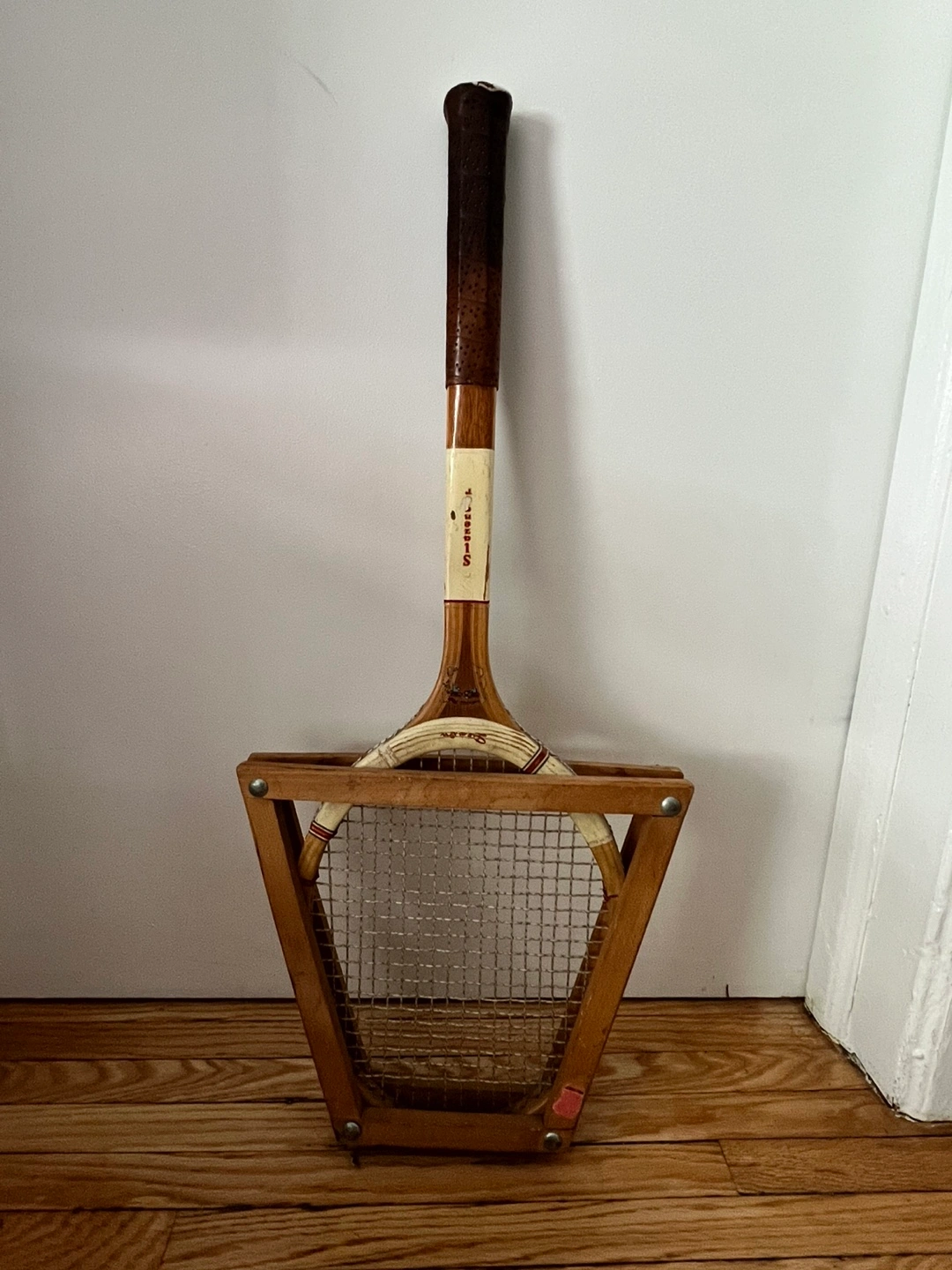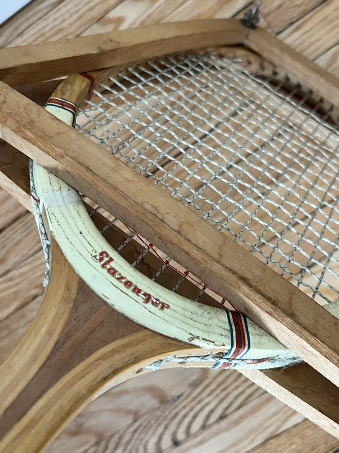 Antique Slazenger tennis racket. Wooden frame. Made in England. Features a leather grip and unique stand. Shows signs of age and wear.