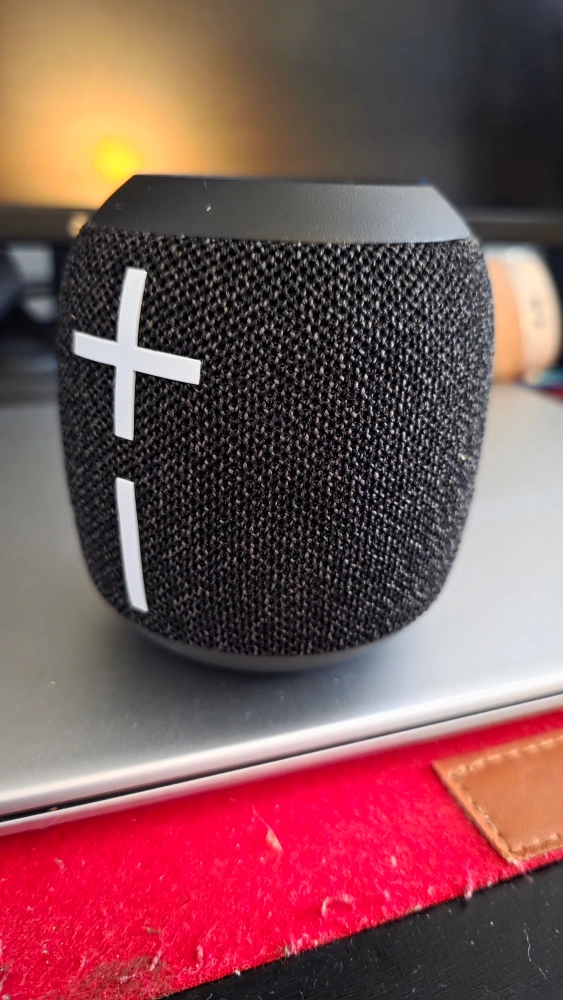 Portable Bluetooth speaker. Black fabric covering. Includes carabiner. Small and compact. just took it out the box, I have all the original documents and charging cord for it aswell