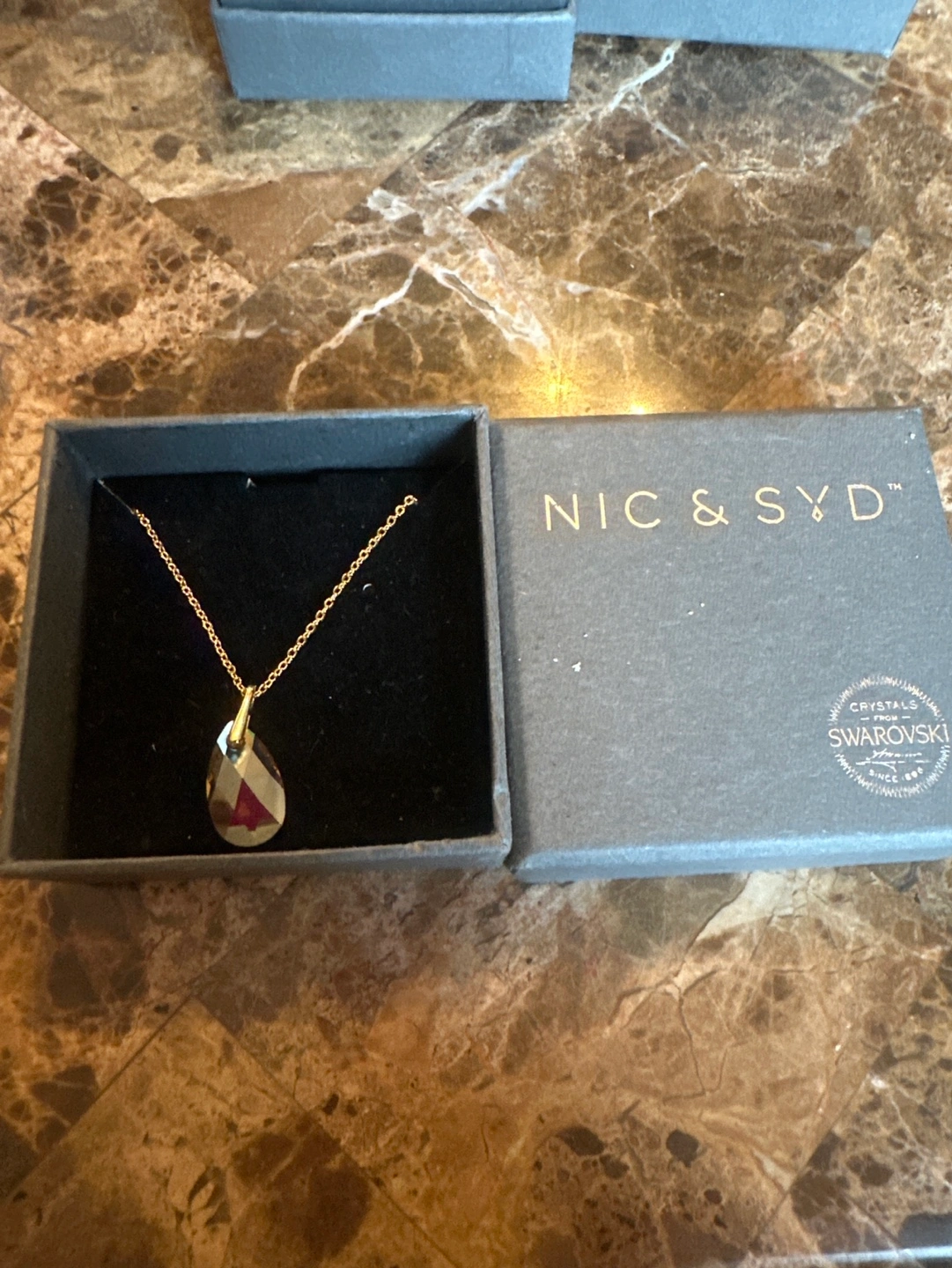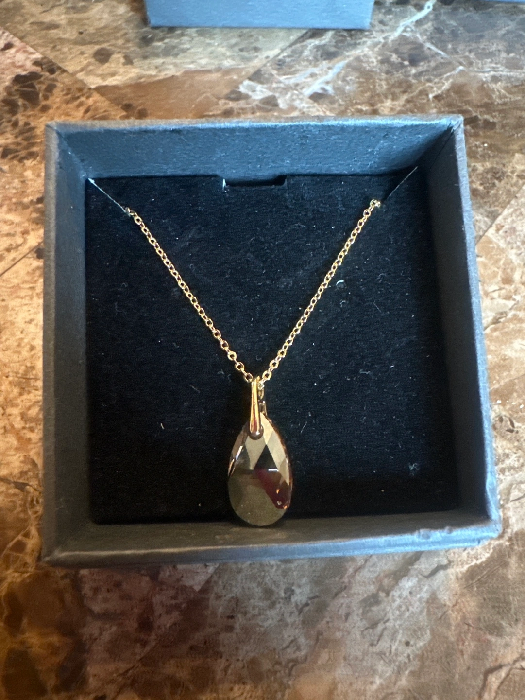 Elegant gold chain necklace. Features a dark teardrop-shaped Swarovski crystal pendant. Comes in original box. Beautiful statement piece.