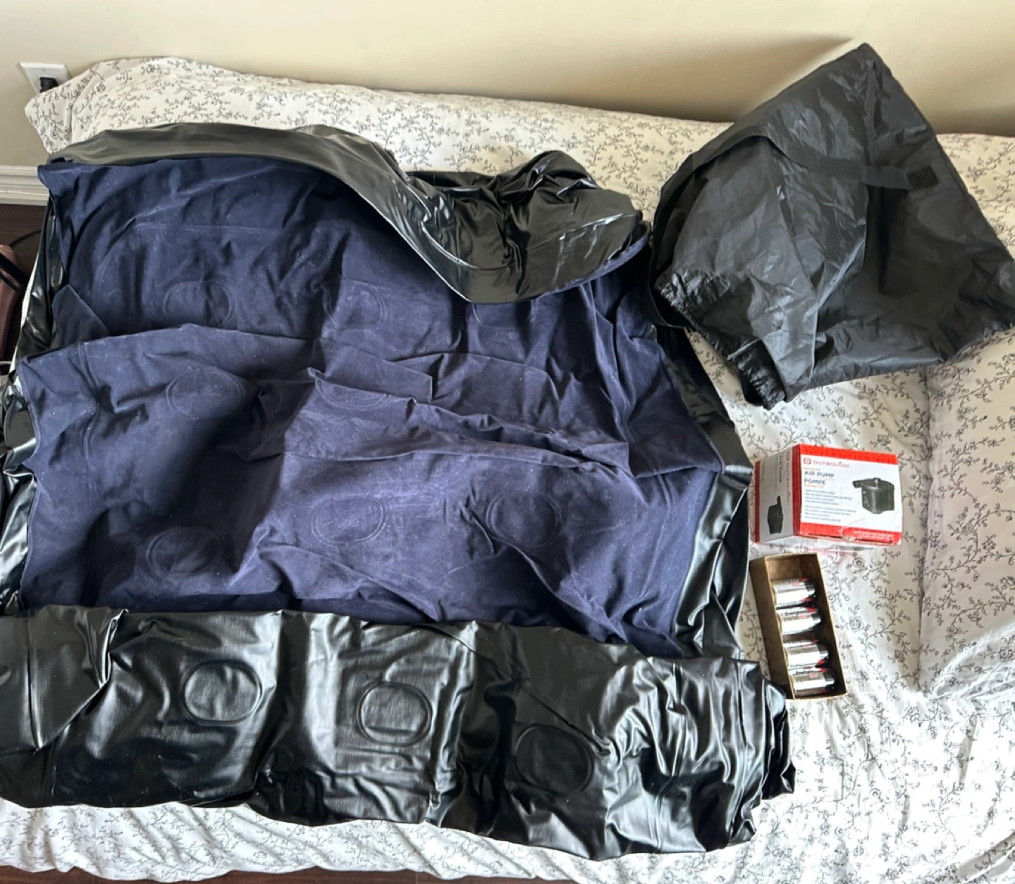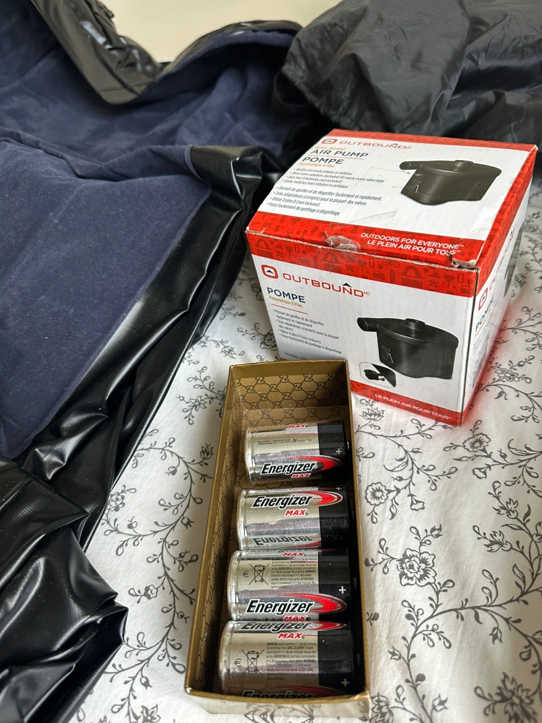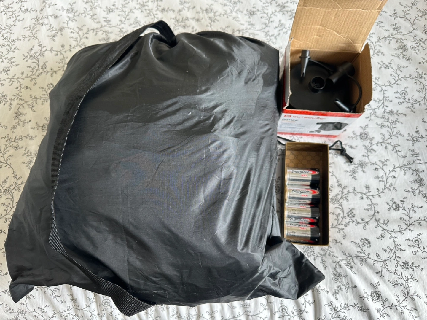 Outbound Twin Air mattress, portable pump, and carrying bag. Includes four Energizer Max batteries. Only used it 4 times, like new. If you have more questions feel free to contact me!