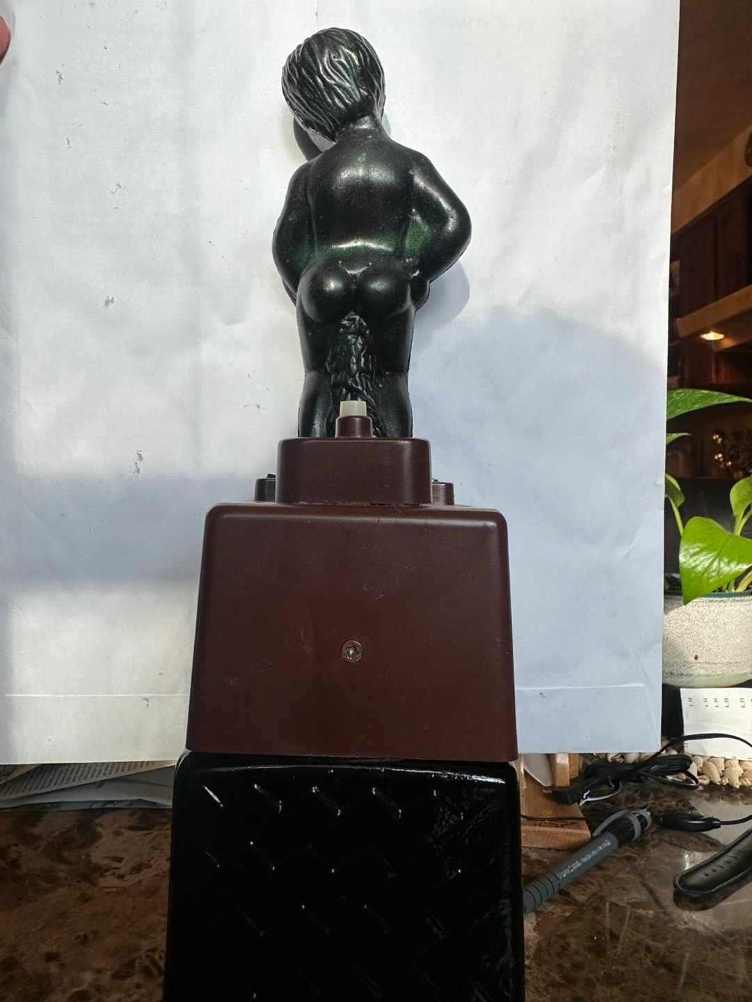 245Unique vintage liquor dispenser. Features a Manneken Pis figurine on top. Dark brown base and dark glass reservoir. Masterpiece brand.