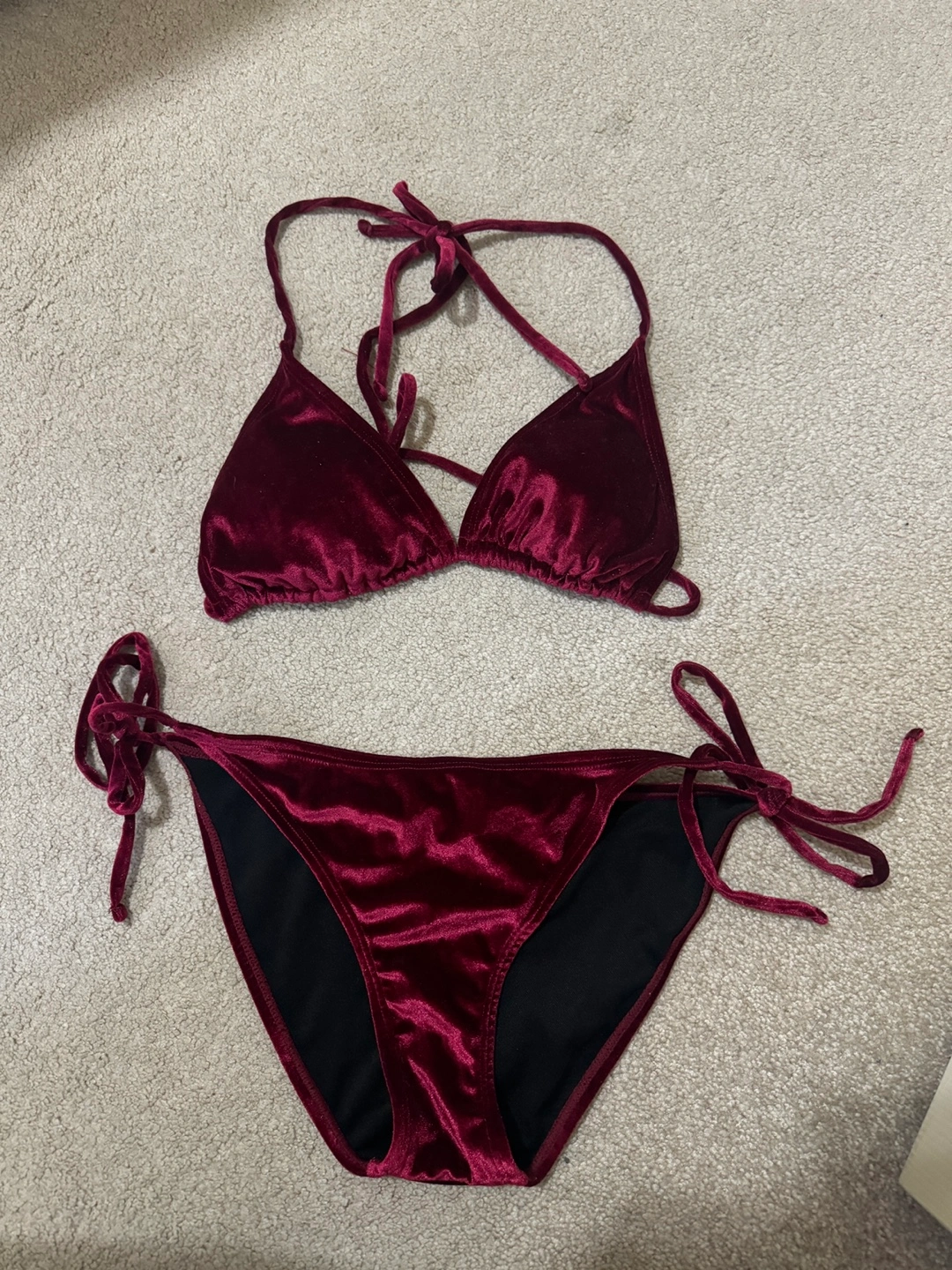 Stunning burgundy velvet bikini. Triangle top and cheeky bottom. Adjustable ties. Excellent for a summer vacation. Pick up downtown available.