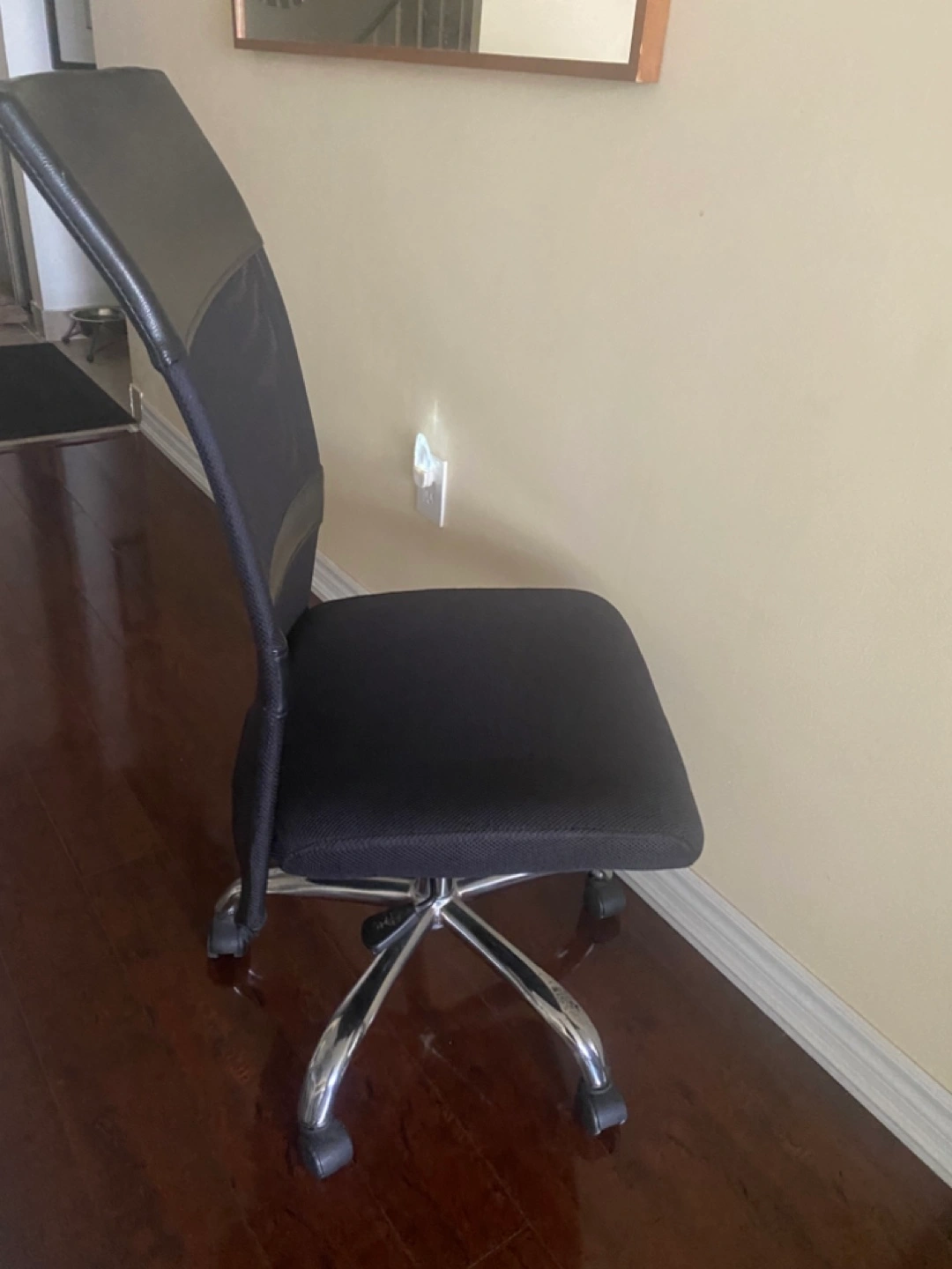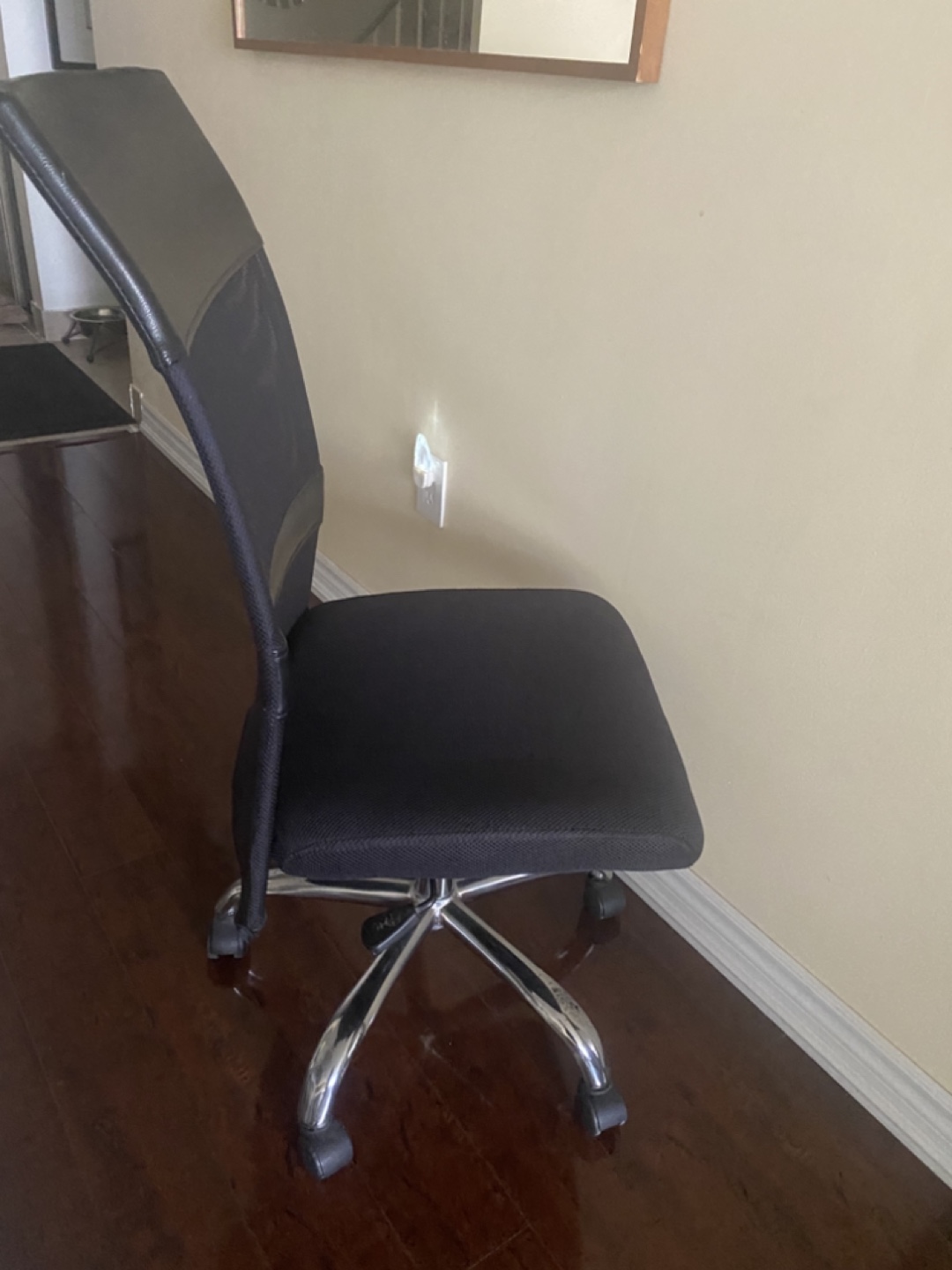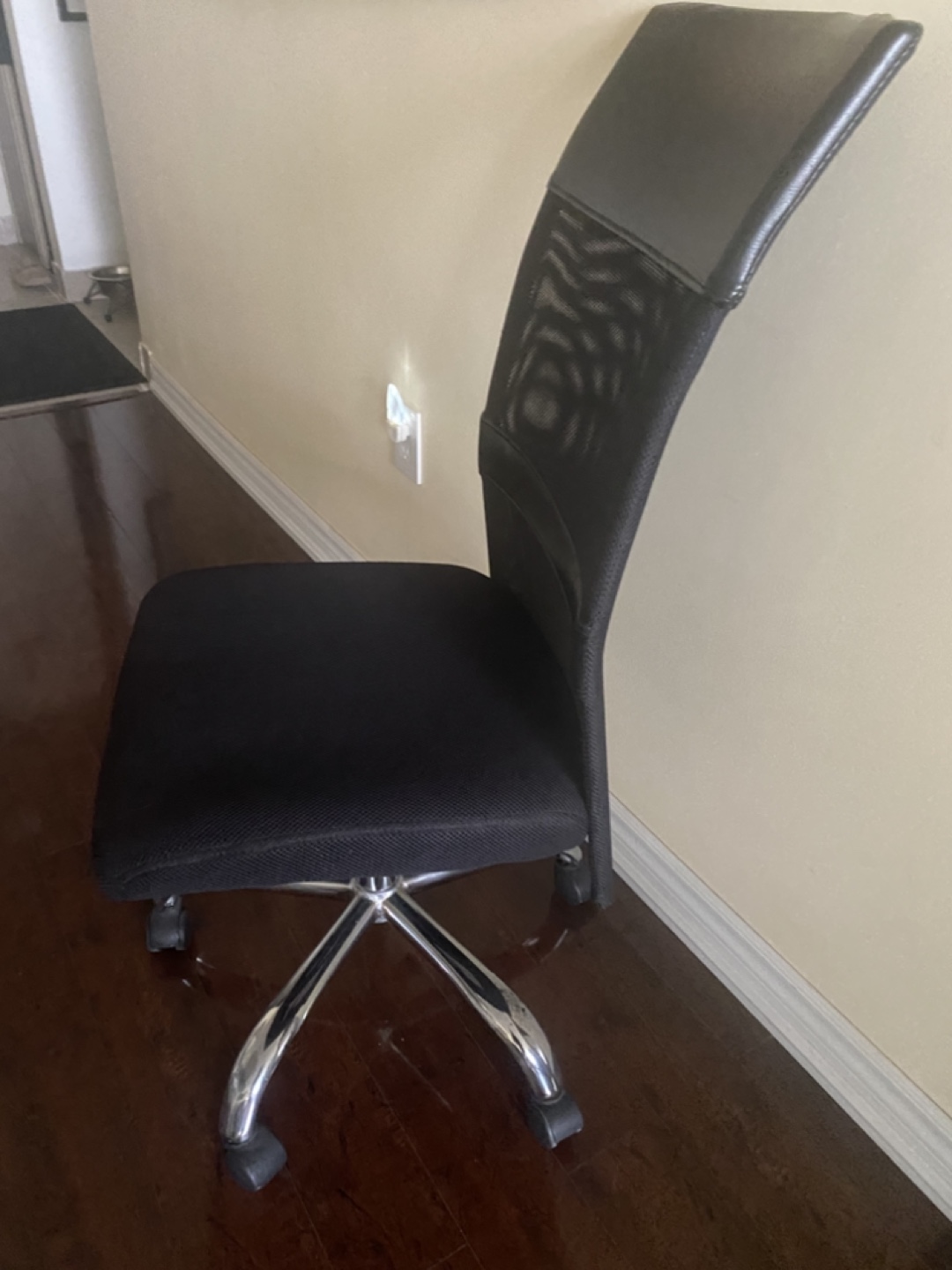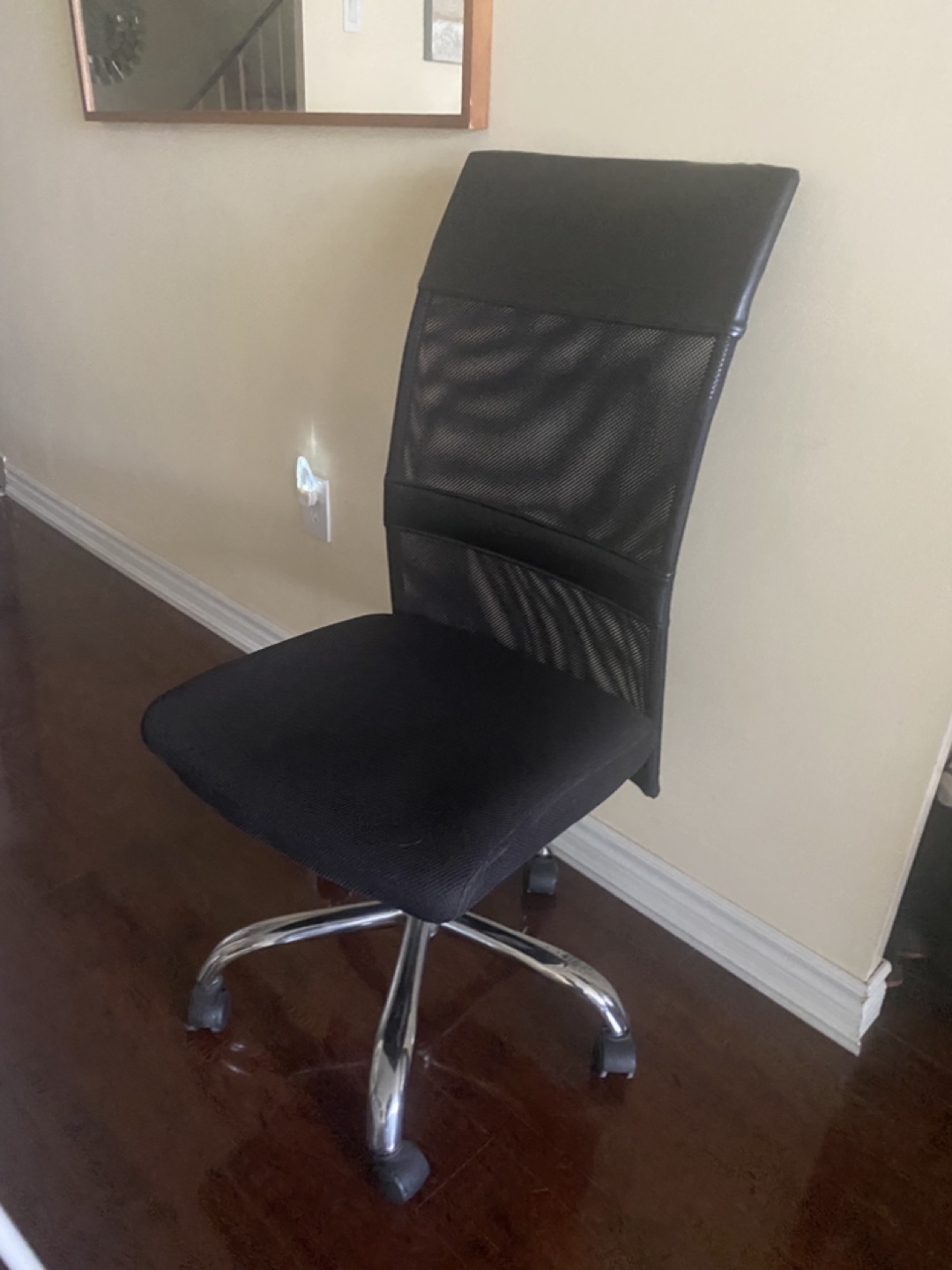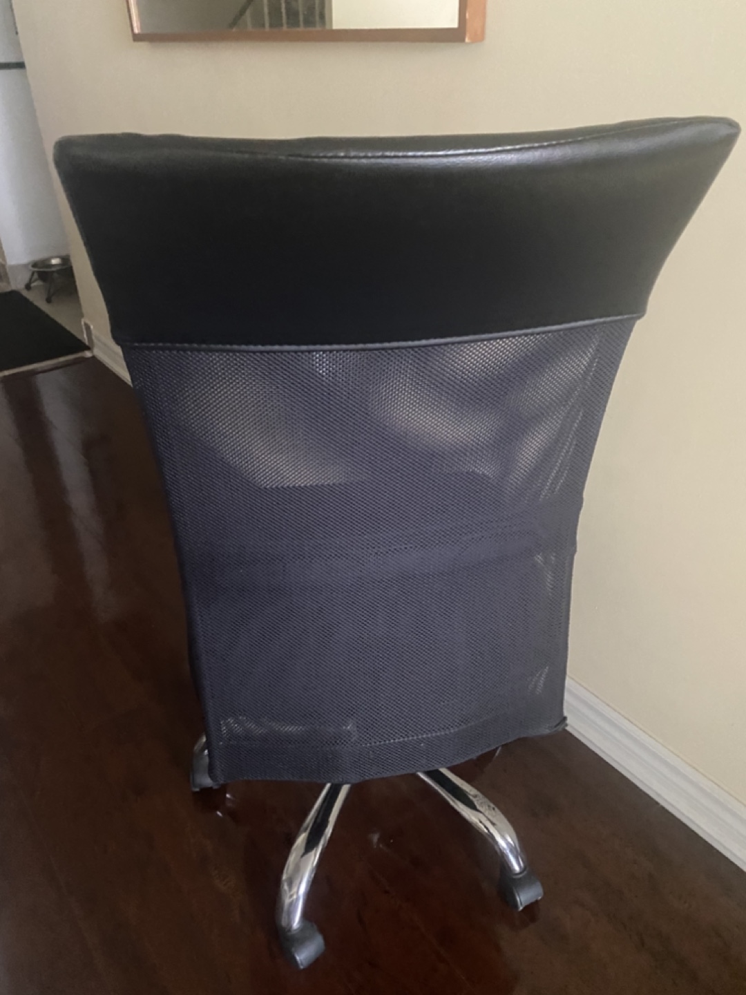 Comfortable office chair. Mesh back and padded seat. Chrome base with five caster wheels. Good for home or office use.