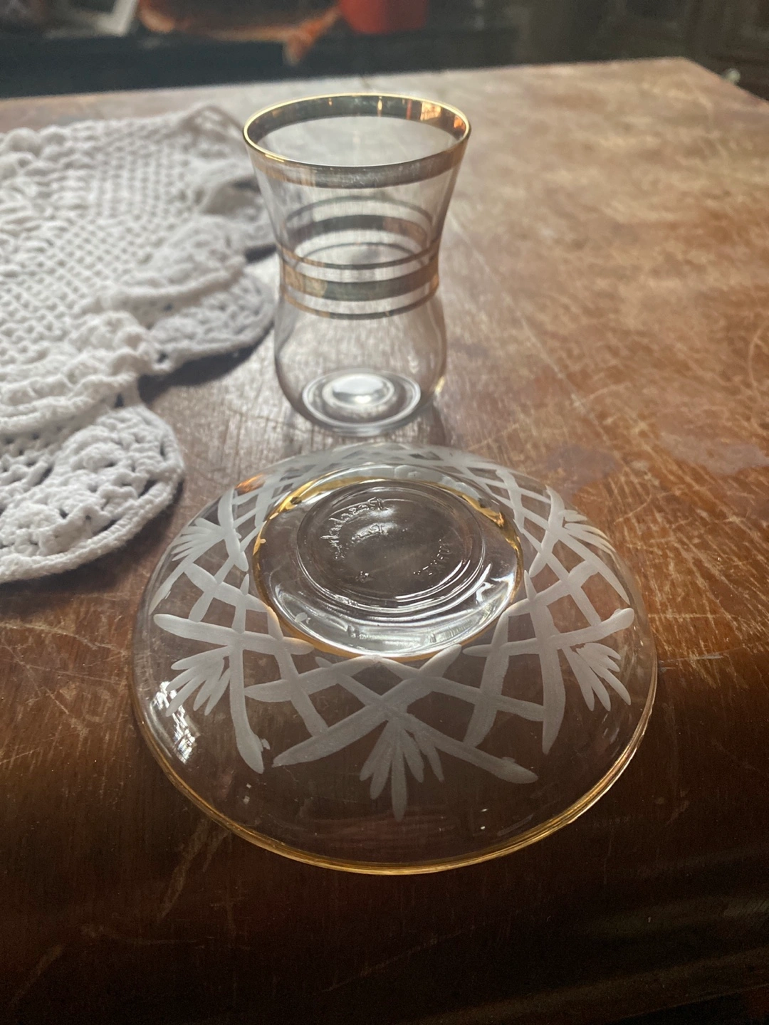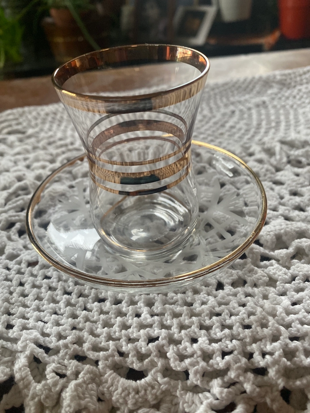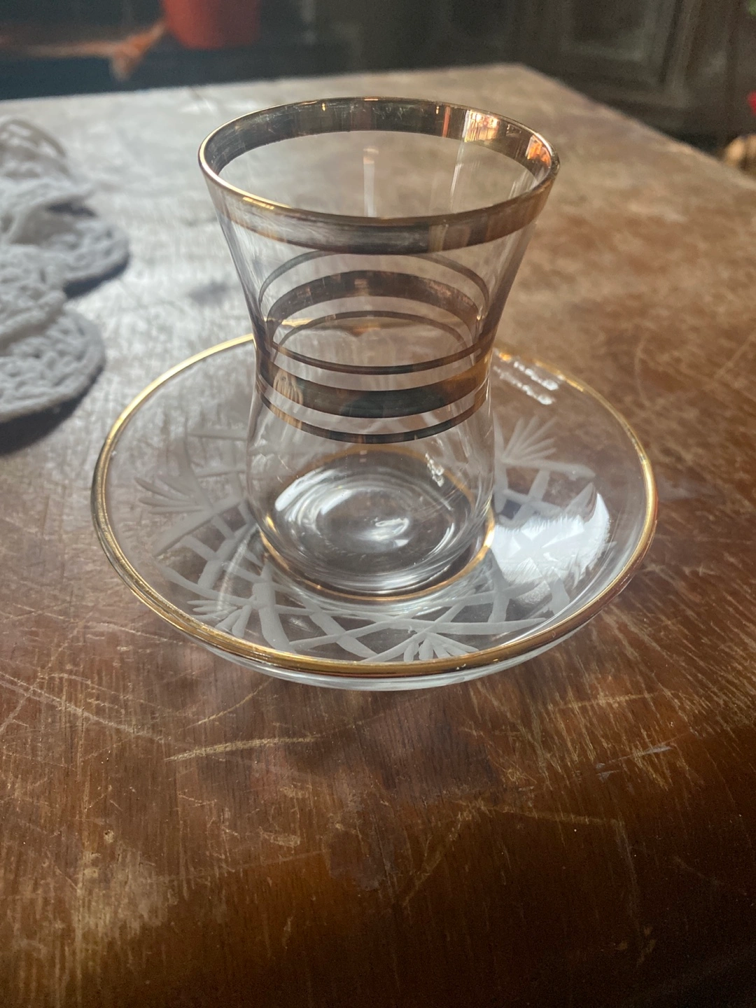 Elegant tea cup and saucer set. Clear glass with gold accents. Etched design on saucer. Perfect for Turkish tea or other beverages.