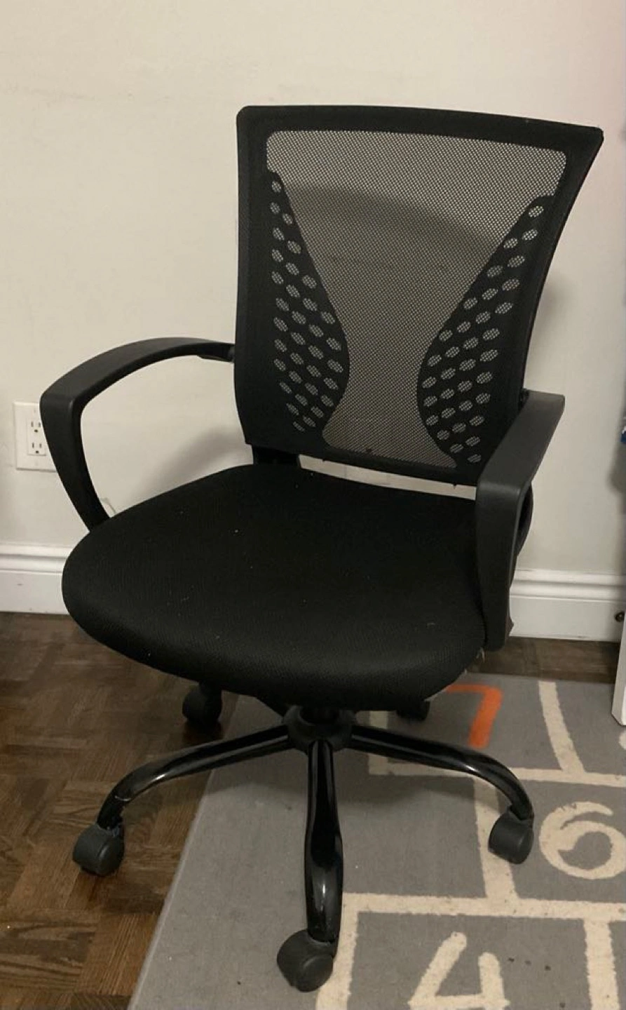 Comfortable office chair. Mesh back and fabric seat. Black frame and arms. Five caster wheels. Suitable for home or office use.