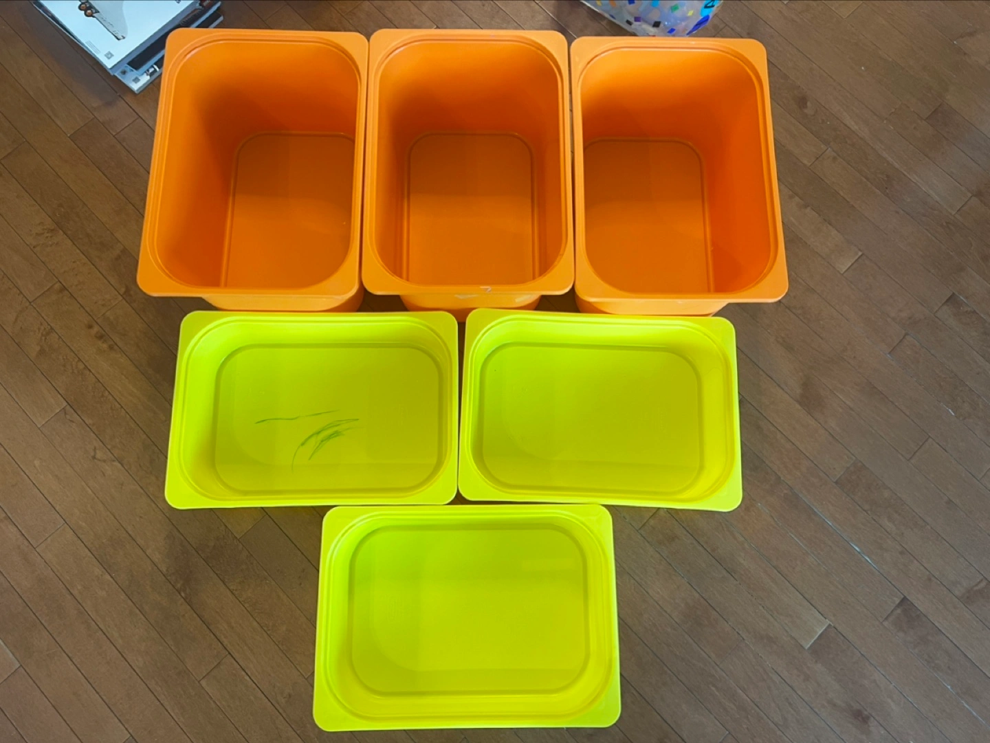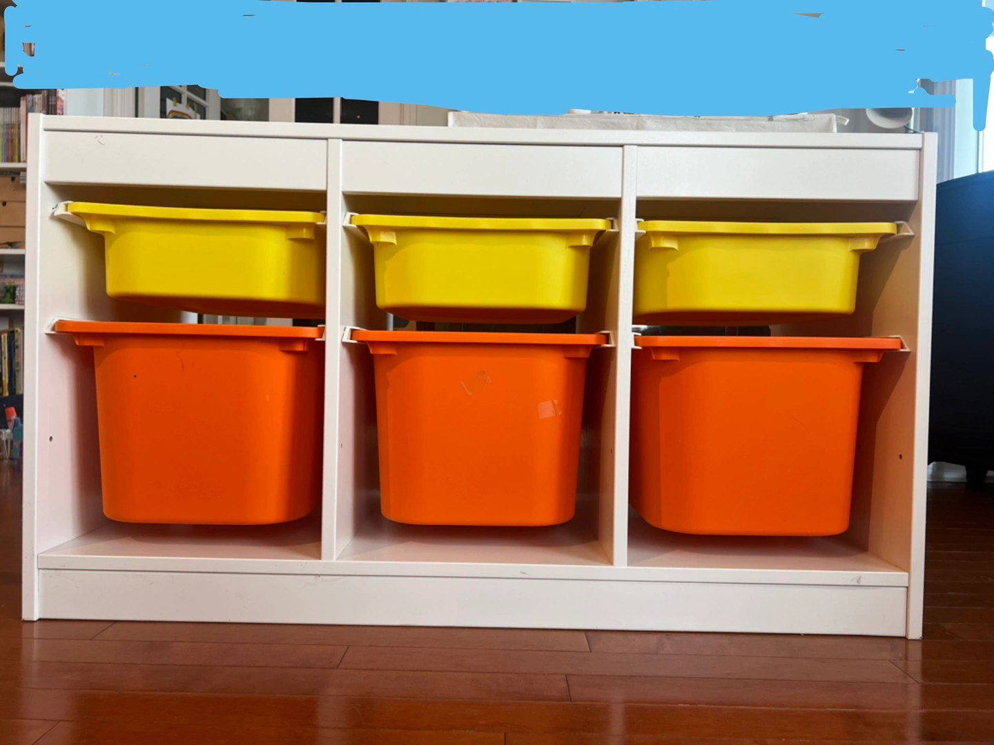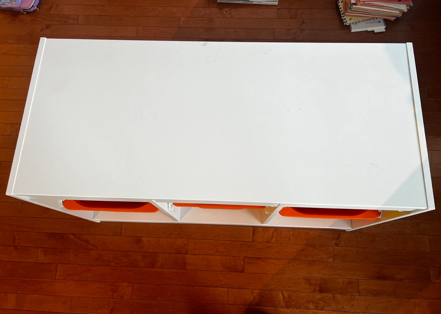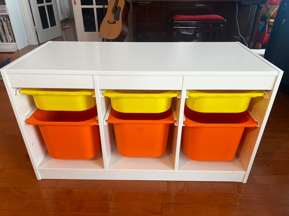 White storage combination. Includes three orange and three yellow plastic storage bins. Excellent for organizing children's toys or other items. Some minor wear. Pick up only.