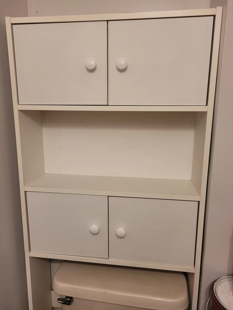 Freestanding white cabinet, features two upper doors, an open shelf, and two lower doors. Ideal for bathroom storage. Simple design, good condition.