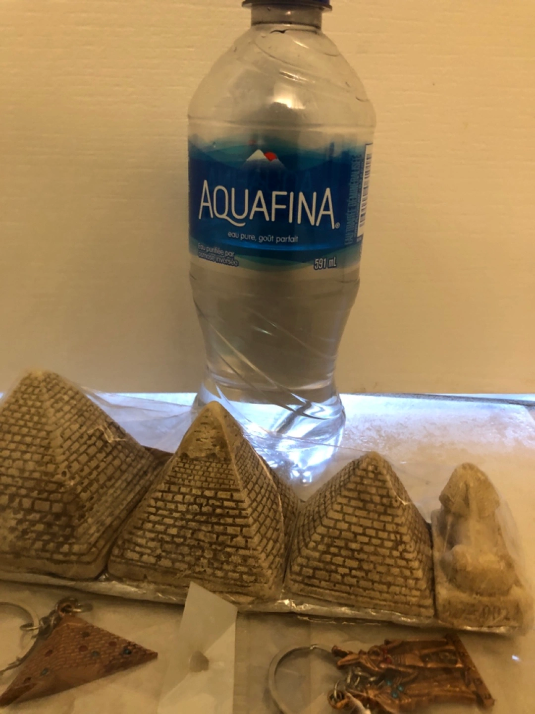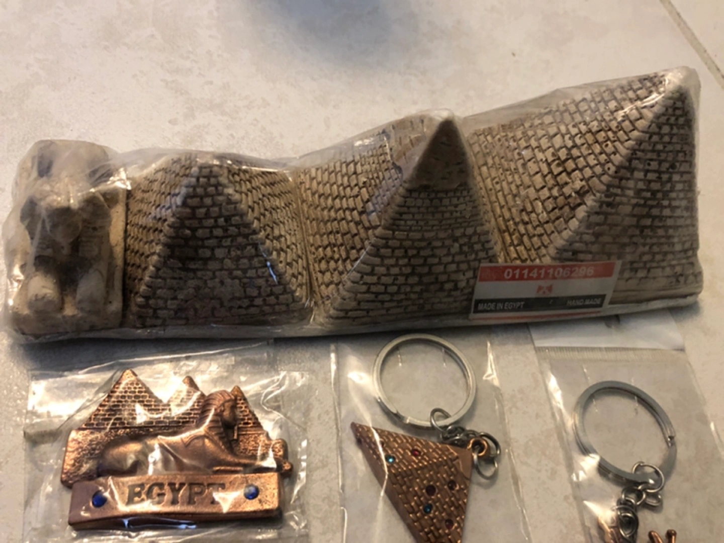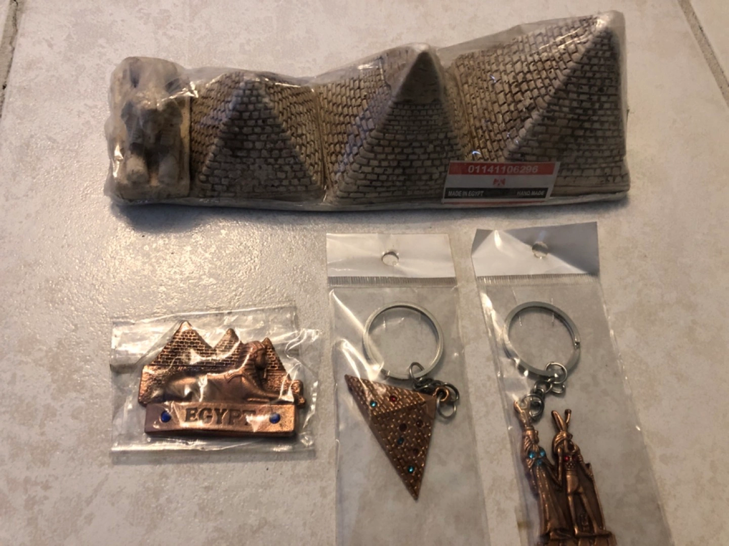 1 key chain, one magnet, 3 pyramids and sphinx for decor. All new and packaged. 591mL bottle for size reference. (Pyramid keychain not available).