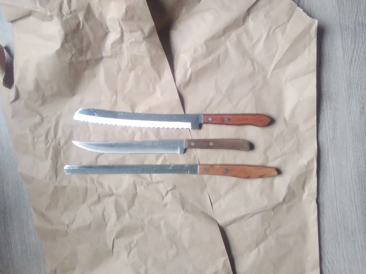 These might be vintage, I don't know. Wooden handles. Stainless steel blades. The first one (Levco brand) has a split in the wood that would need some gluing. Second is Wayne brand and third is Ekco brand. They each have their minor imperfections