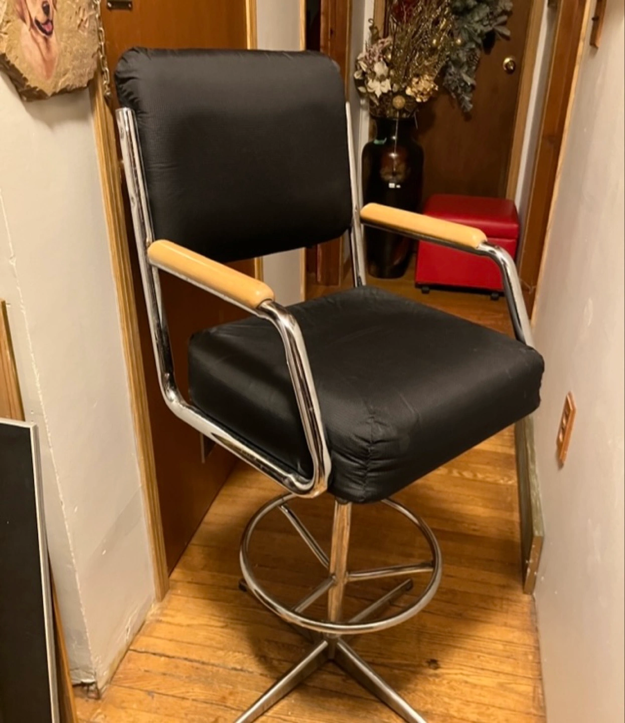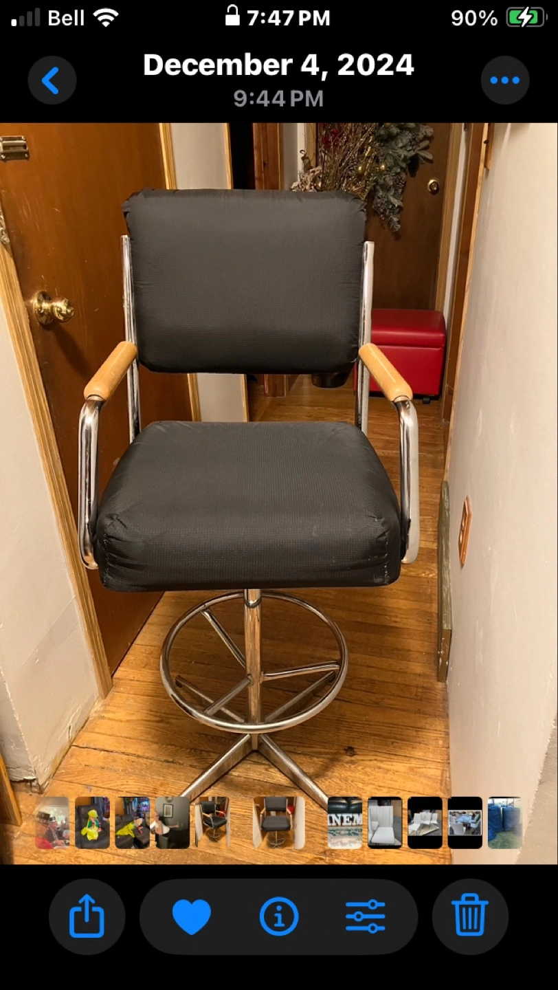Buy & SellVintage Chrome and Wood Swivel Bar StoolVintage Chrome and Wood Swivel Bar Stool$60bar stool seat does go around Chrome frame, padded black seat, and light wood armrests.WHERE TO MEETSutton WestView MapSELLERSharonSutton West221 review0 chats·0 favorites·38 viewsSEND CHAT TO SELLERHi Sharon! I’m interested in your listing.Hi Sharon! I’m interested in your listing.Get the Karrot app to chatSign In to chat