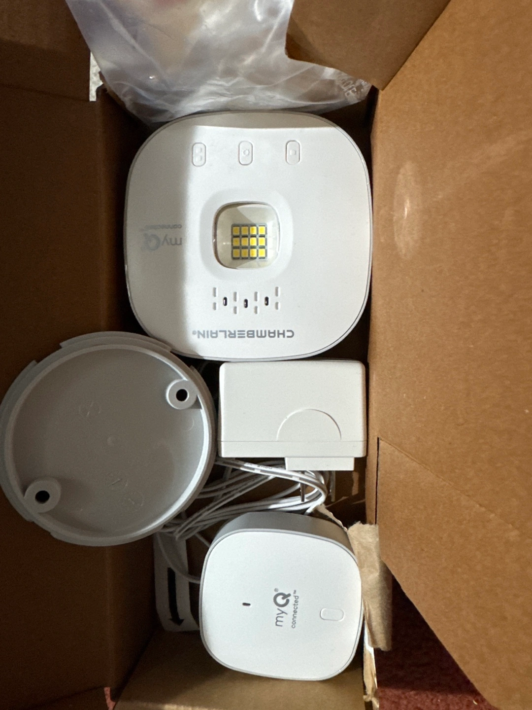 New, unopened Chamberlain MyQ Smart Garage Control. Includes all components: main unit, sensor, and power adapter. Easy setup for convenient garage access.