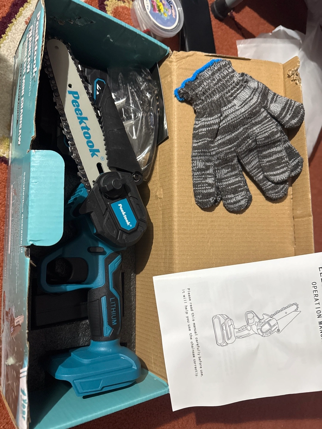 New, in box. 6-inch blade. 21V lithium battery. Lightweight and powerful. Includes gloves and manual. Perfect for small branches.