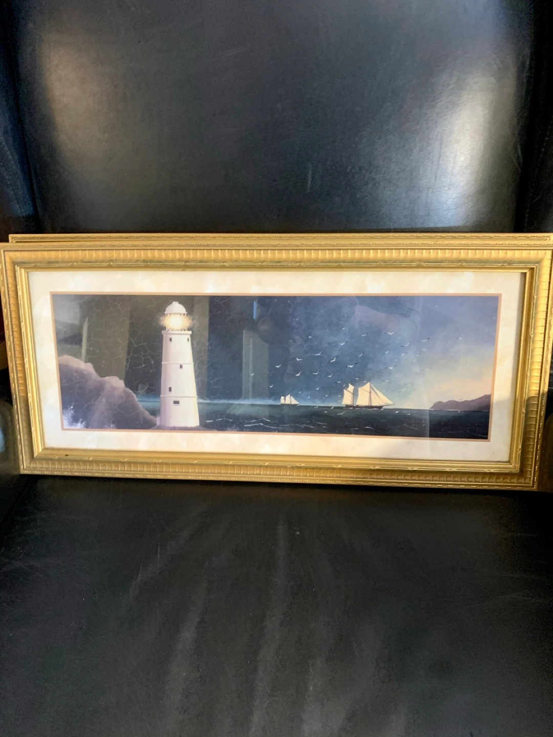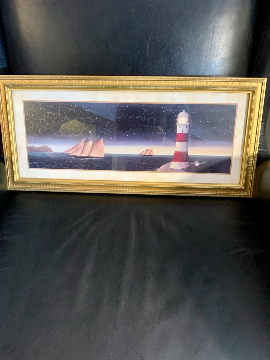 Lovely framed artwork. Depicts a lighthouse and sailboats at night. Gold-coloured frame. Ready to hang. $30 for two pictures.