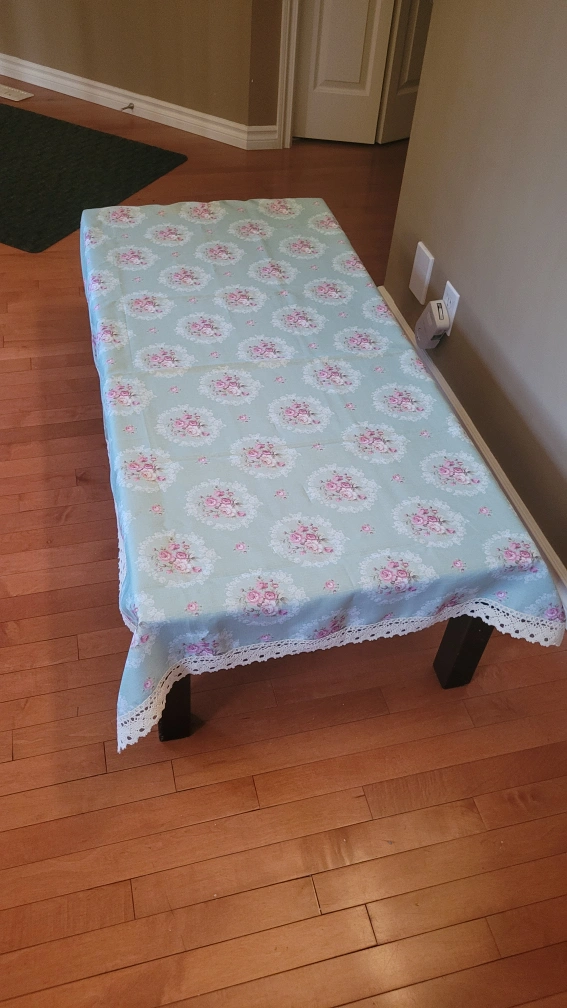 Lovely rectangular tablecloth. Features a pastel green background with a repeating floral pattern. Soft, light-coloured lace trim around the edges. Adds a touch of elegance to any table.