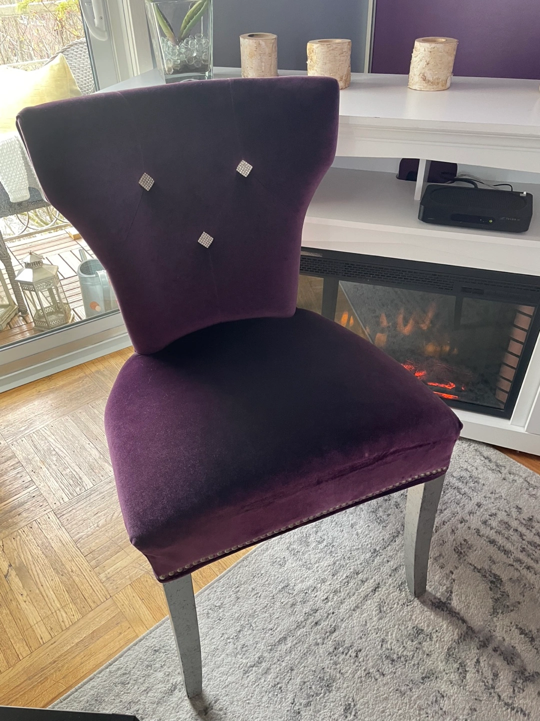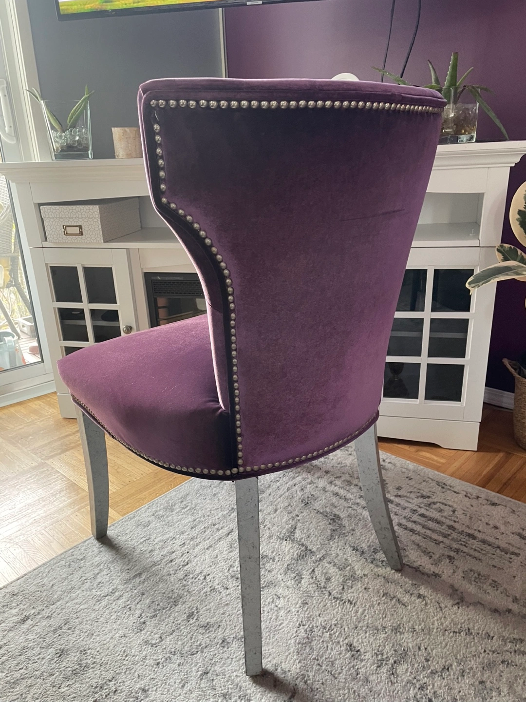 Elegant purple velvet chair. Features silver nailhead trim and subtle crystal embellishments. Dark grey wood legs. Stylish addition to any dining ,living room area