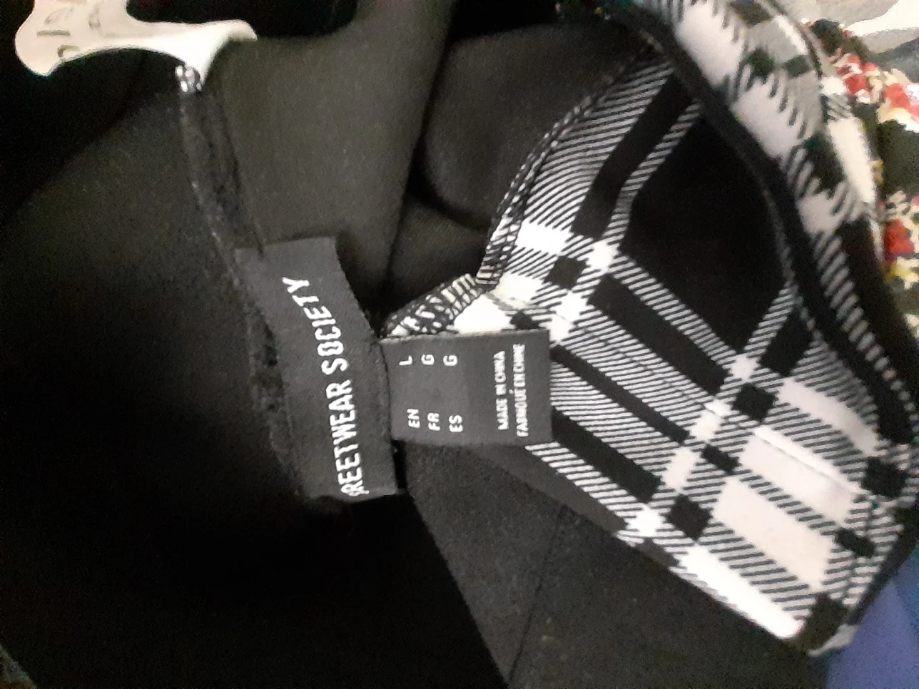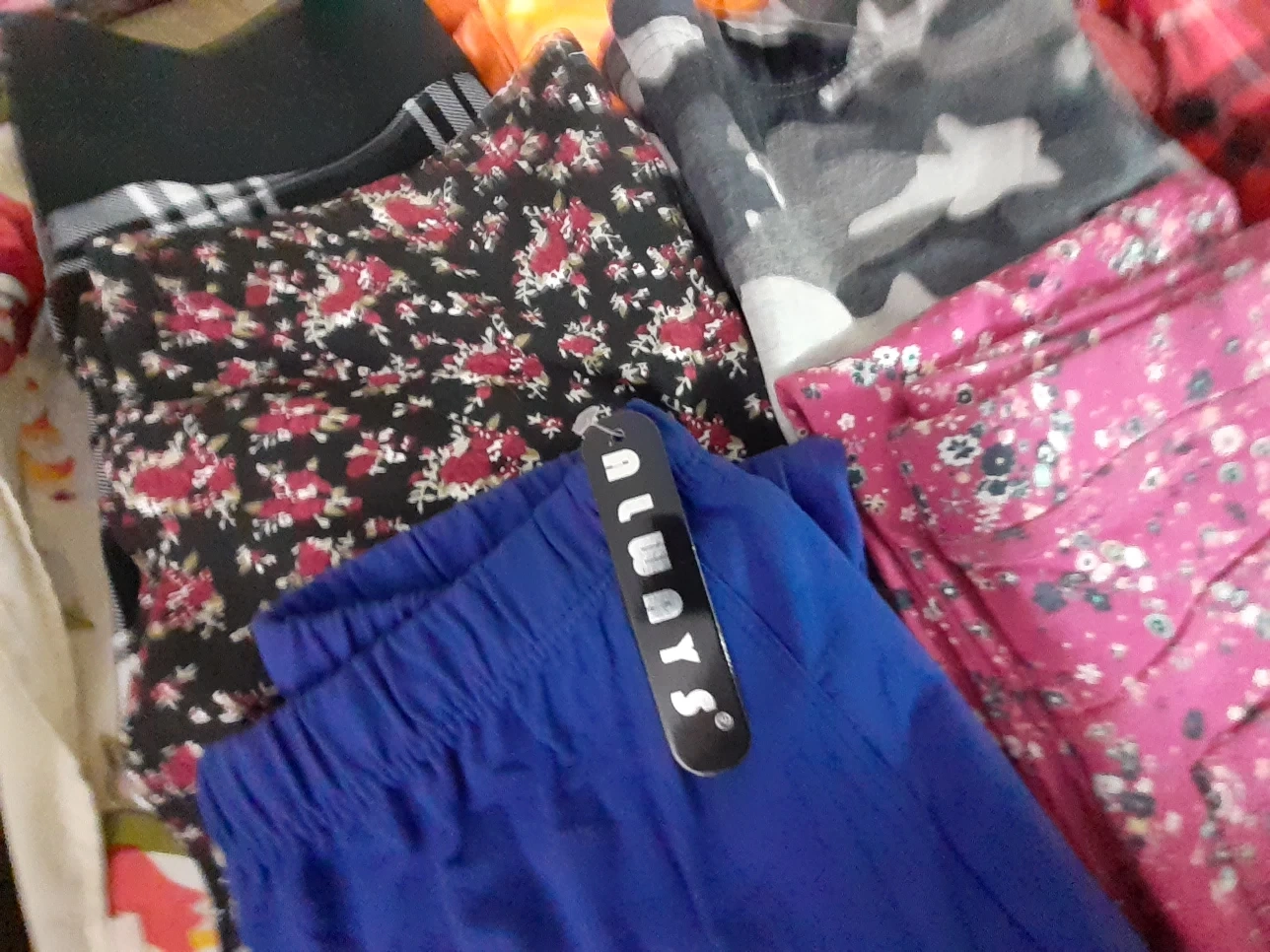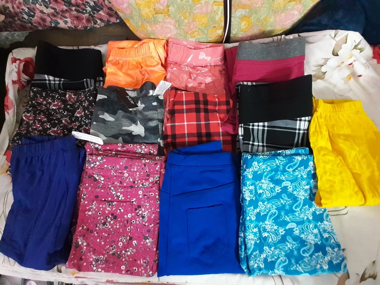 Five pairs of women's leggings. Various colours and patterns. Size large. Good condition.Price jens $5 and $6 black and white check pants $5 each,print pants each $5 N Leggings each $5 pick up Markham and Lawrence .