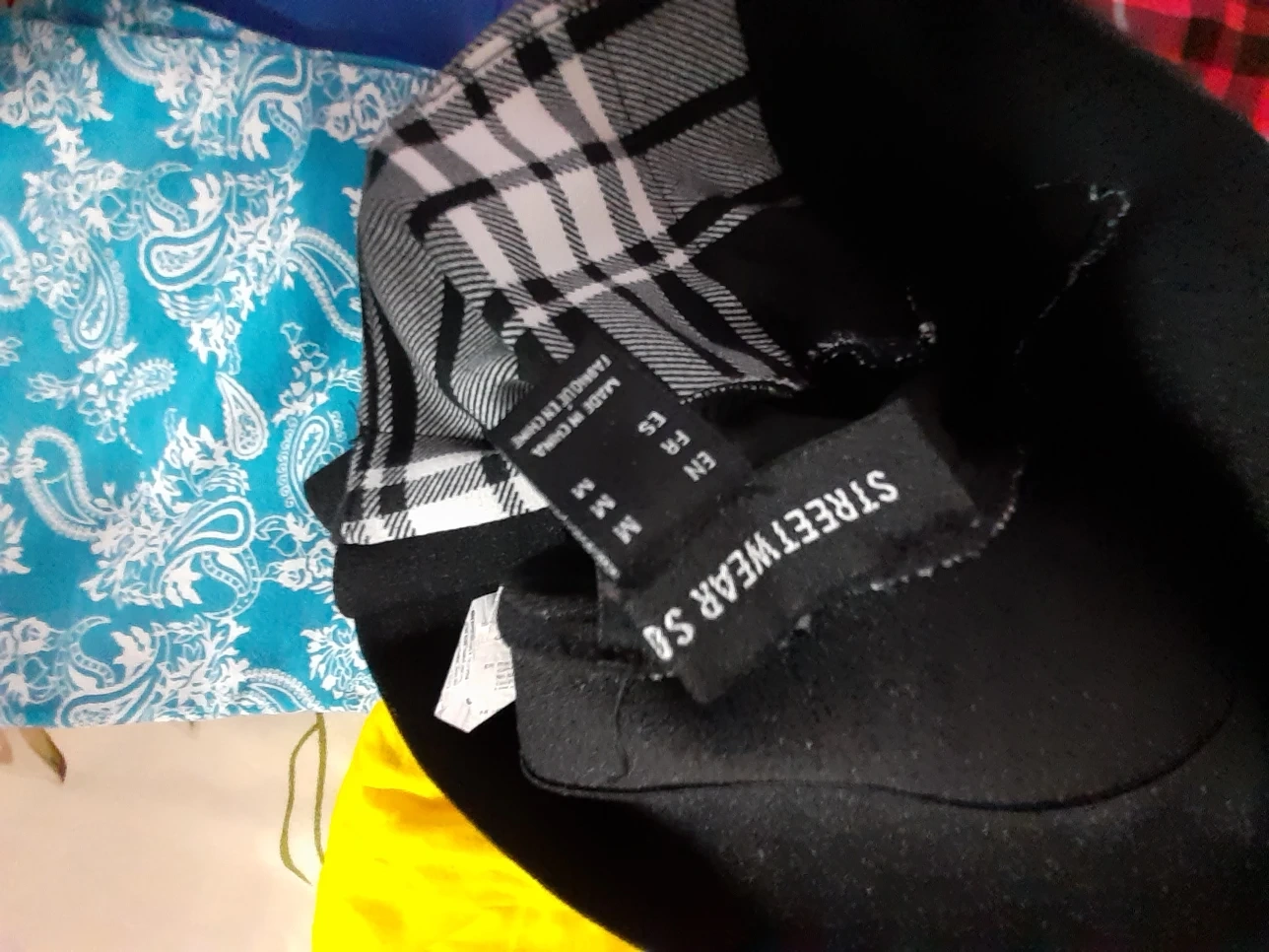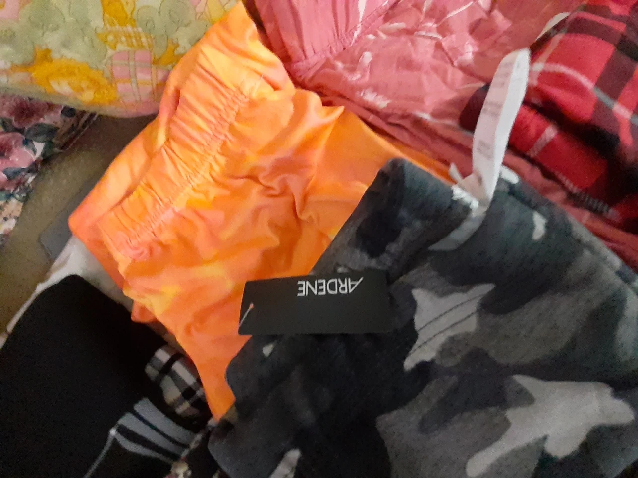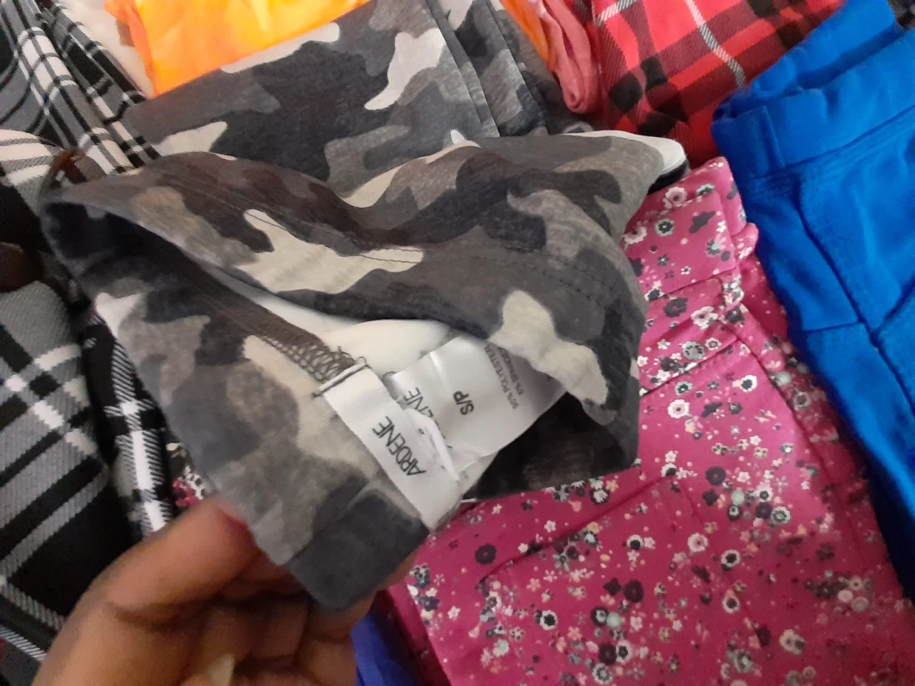 Five pairs of women's leggings. Various colours and patterns. Size large. Good condition.Price jens $5 and $6 black and white check pants $5 each,print pants each $5 N Leggings each $5 pick up Markham and Lawrence .