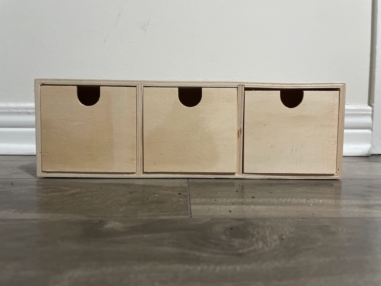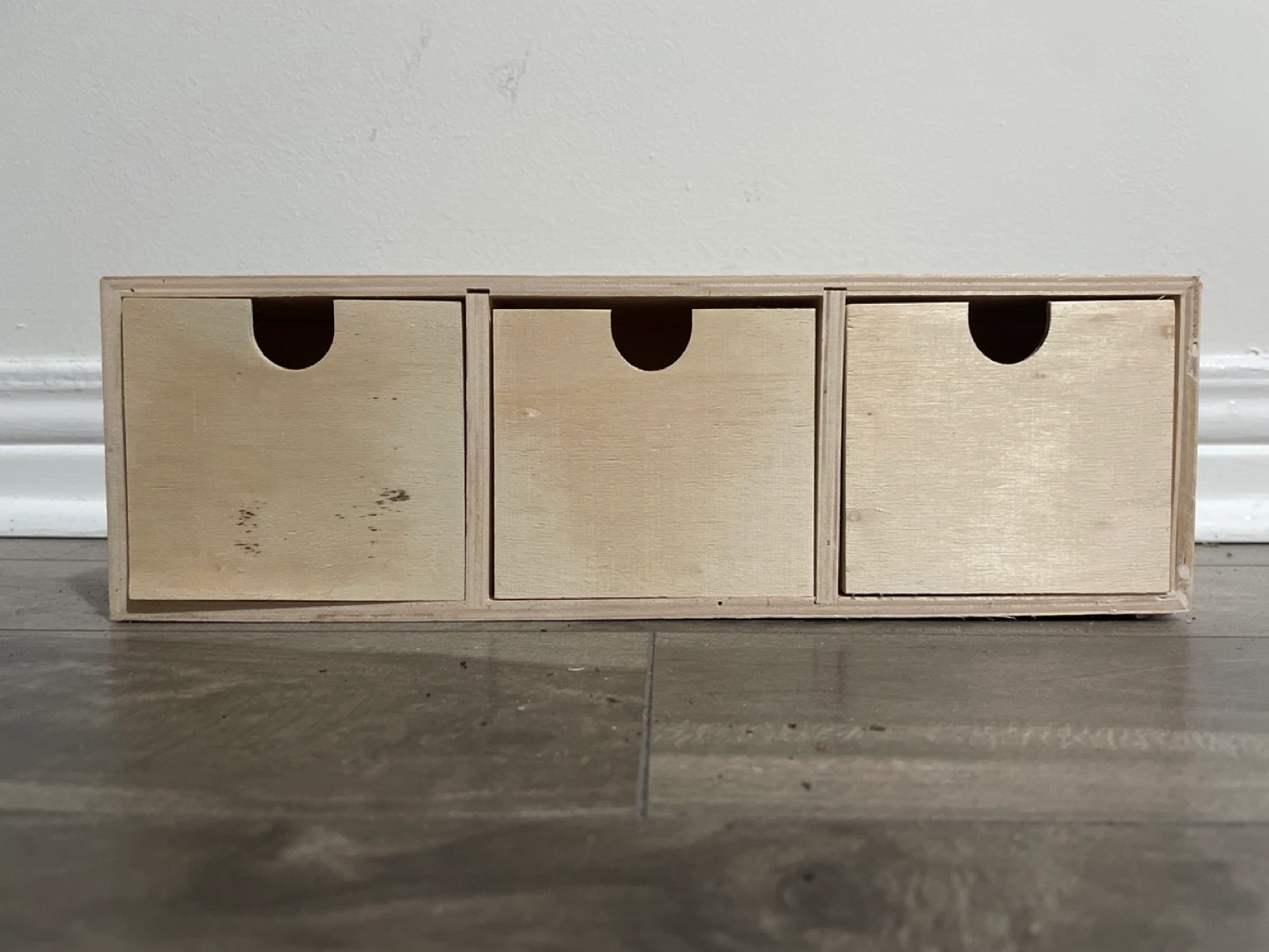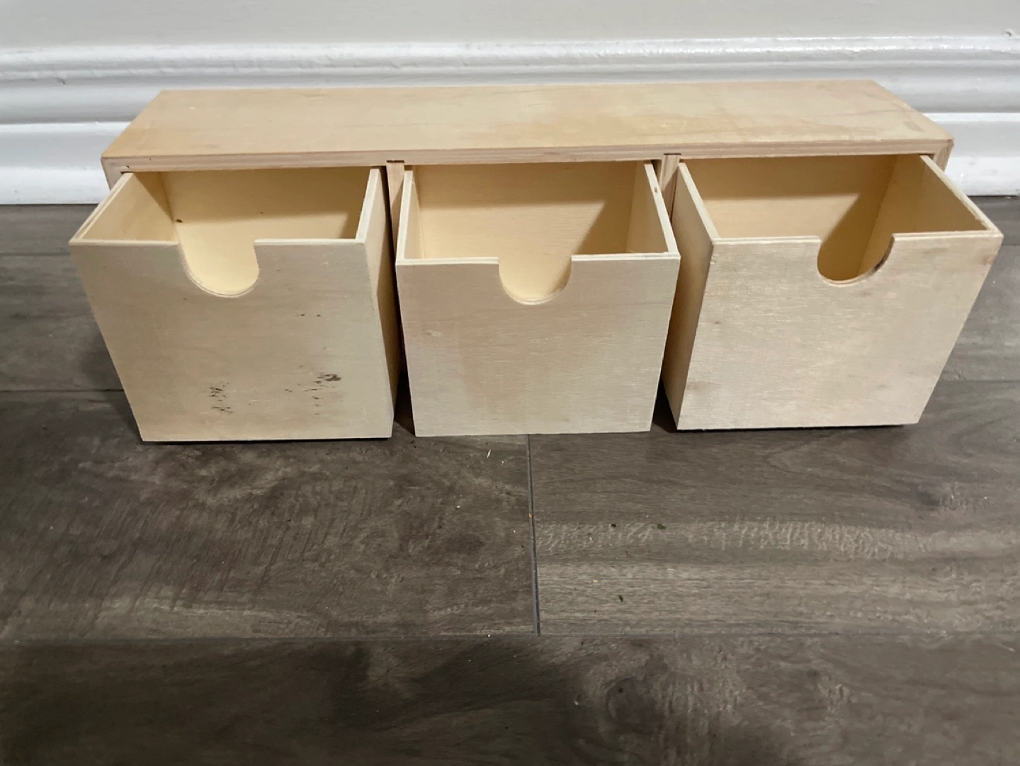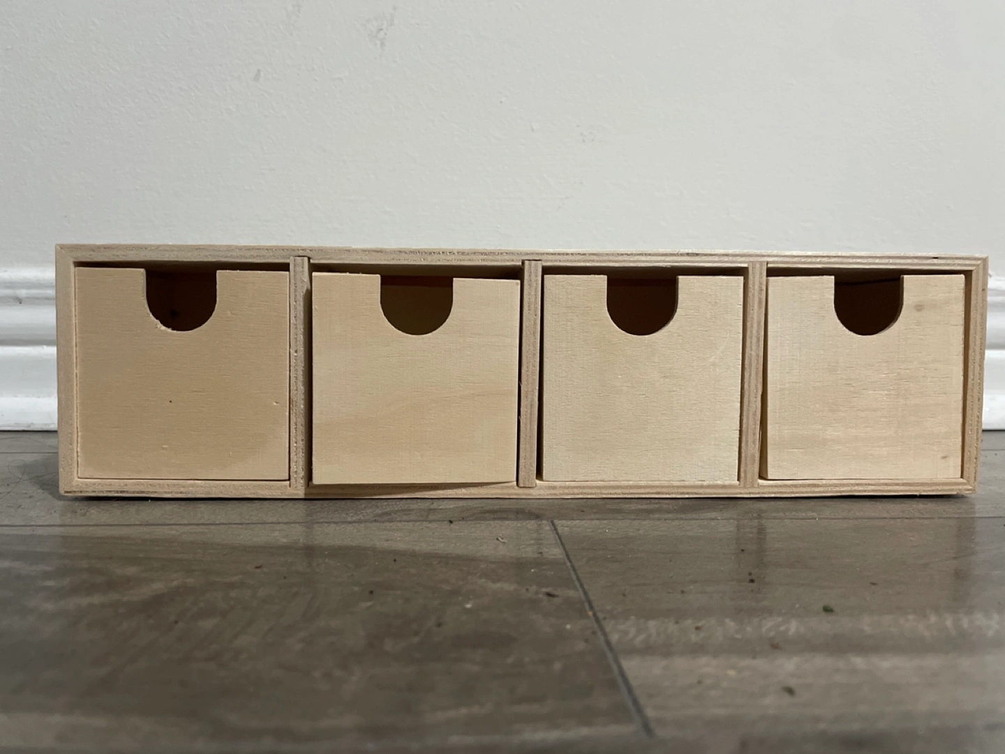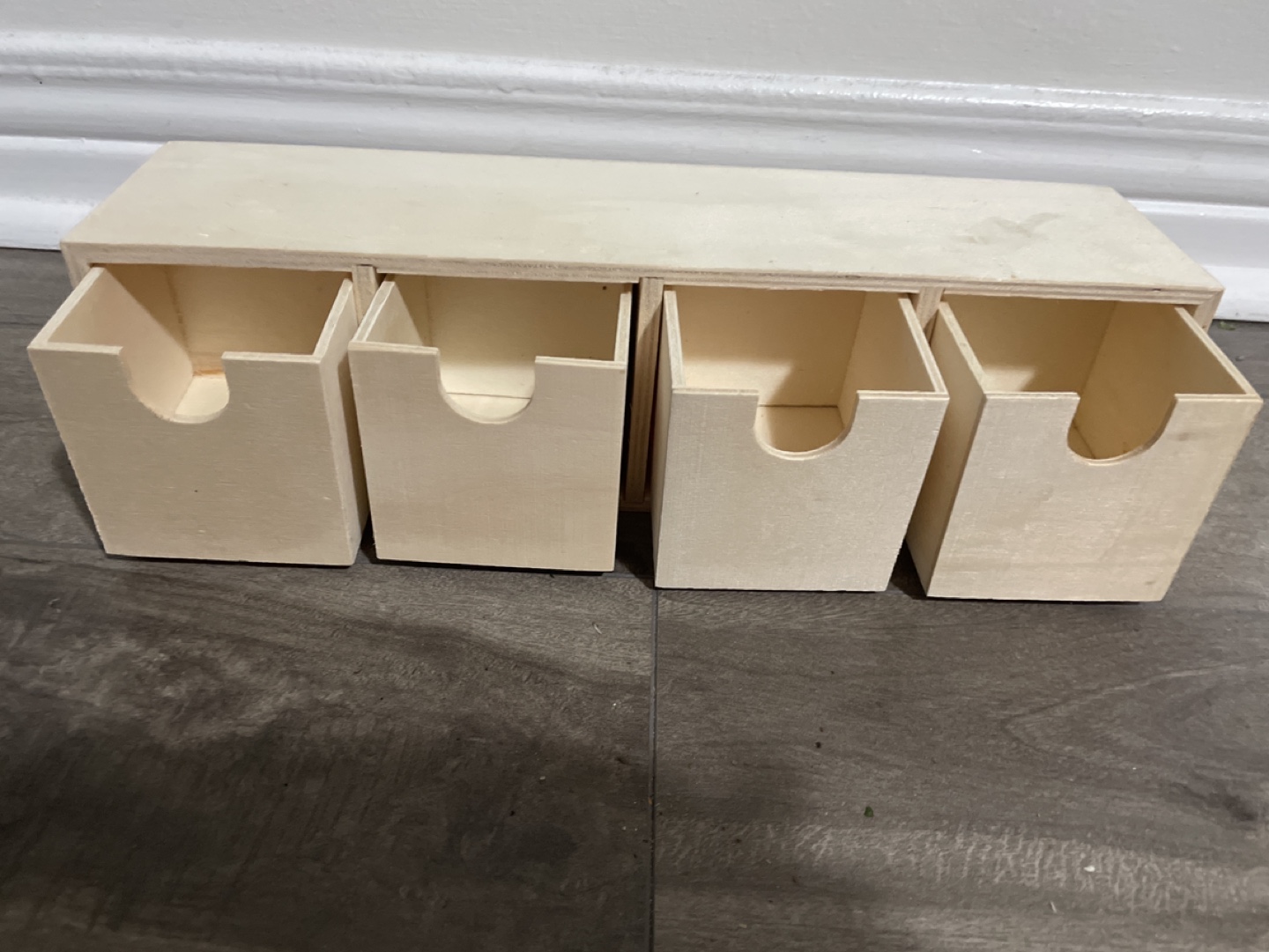 Small wooden organizer. One with four drawers and 2 of them with three drawers. Great for organizing small items. Minimalist design. Light-coloured wood. $2 each