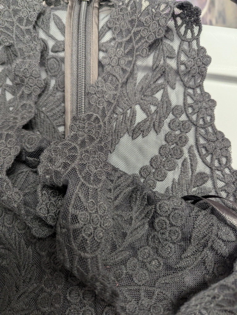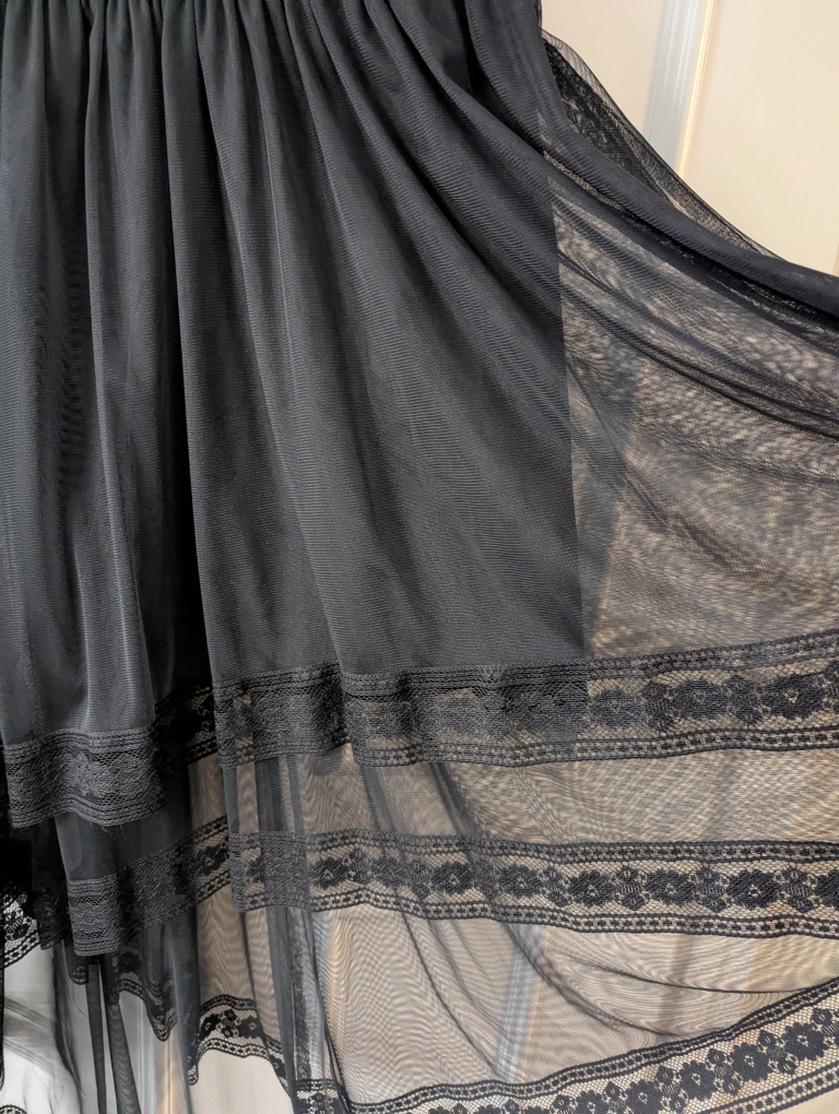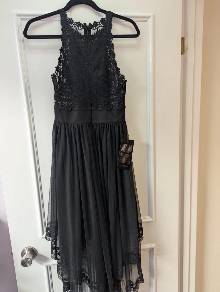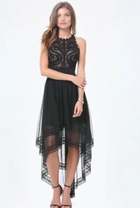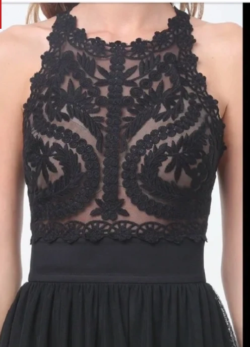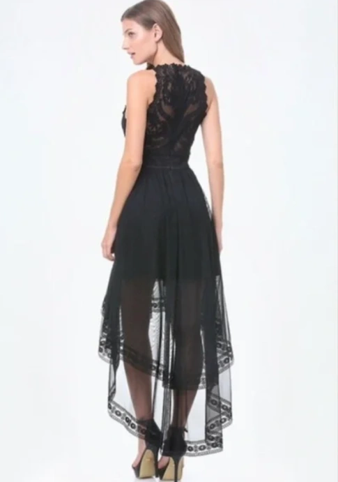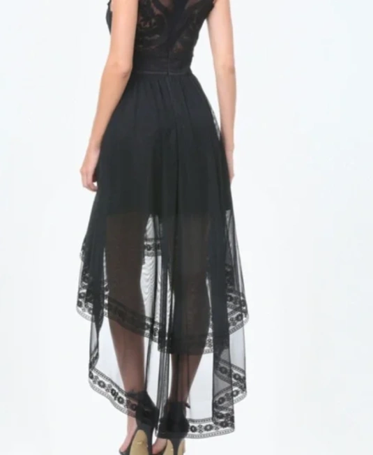Stunning black high-low dress. Features delicate lace bodice and flowing tulle skirt. High neckline and sleeveless design. Perfect for special occasions.