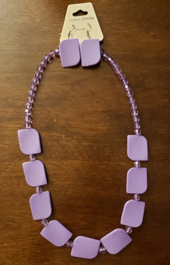Beautiful statement necklace and earring set. Features a lavender colour scheme. Necklace includes faceted beads and matte lavender rectangular pendants. Matching earrings feature the same matte lavender rectangular design. Perfect for adding a touch of elegance to any outfit.