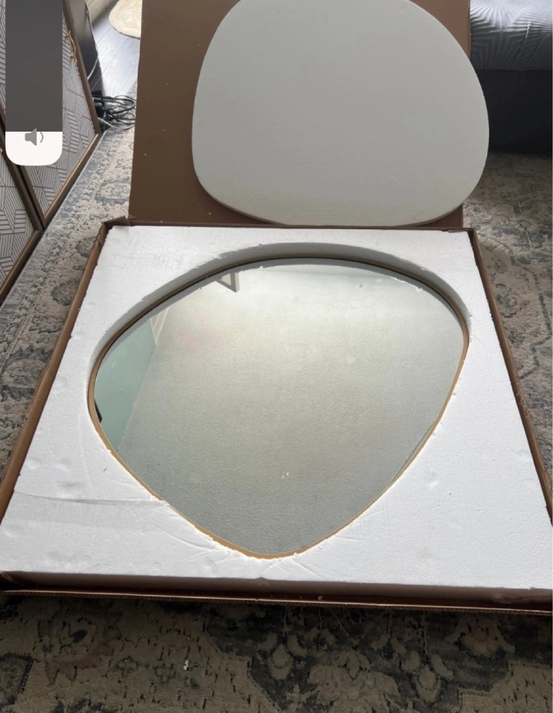 Unique, organically shaped mirror. Gold metal frame. Perfect for adding a touch of modern style to any room. Brand new in open box.